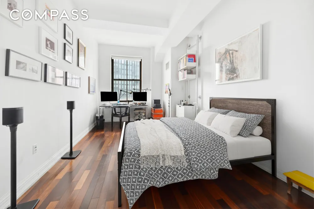 The king-sized primary suite is a true retreat, boasting three custom closets and a five-fixture en-suite bath with a deep soaking tub, separate glass-enclosed rain shower, double vanity, and sleek marble and granite finishes. The second bedroom offers generous space for guests, a home office, or additional living flexibility, with a full second bathroom conveniently located nearby. Additional highlights include a Miele washer/dryer, zoned central heating and cooling with Nest controls, and six custom-outfitted closets for exceptional storage.