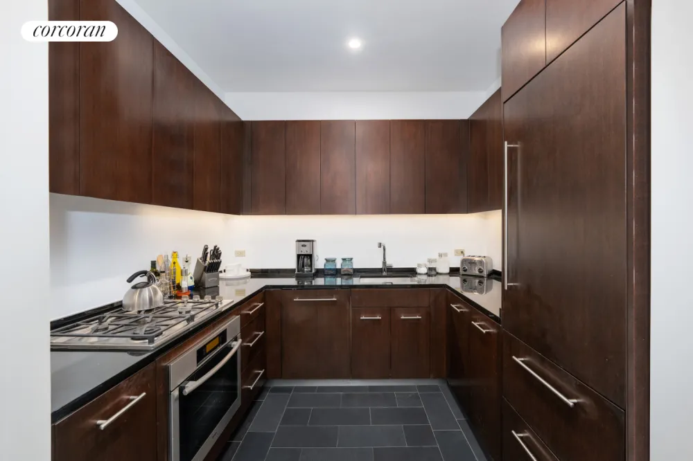 The updated U-shaped kitchen boasts sleek black granite countertops and custom Walnut cabinetry. It is equipped with top-of-the-line appliances, including a Sub-Zero refrigerator and freezer, a Miele oven with a gas cooktop, and a dishwasher.