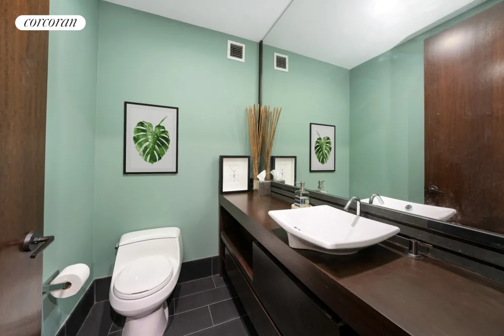 The gracious entrance foyer features a custom California Closet alongside a conveniently located in-unit washer and dryer, offering exceptional storage and everyday convenience. A discreetly placed half bath adds to the home's thoughtful layout.