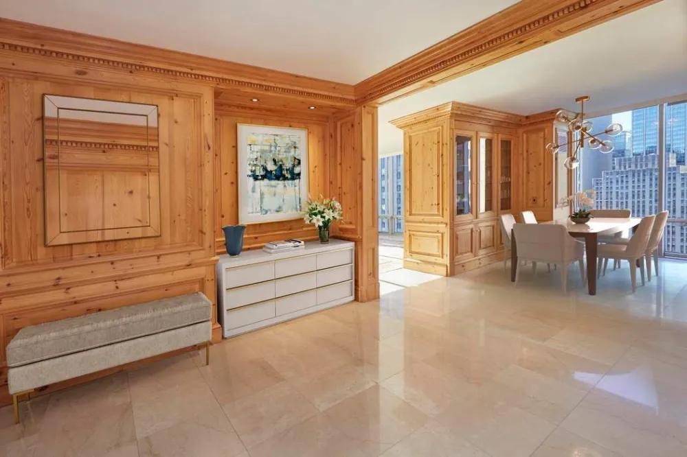 Upon entering, a welcoming foyer leads to a spacious, windowed eat-in kitchen with state-of-the-art appliances and a charming breakfast nook. The adjacent formal dining room and living room boast stunning wood paneling and magnificent cityscape views, creating an elegant atmosphere for both relaxation and entertaining.