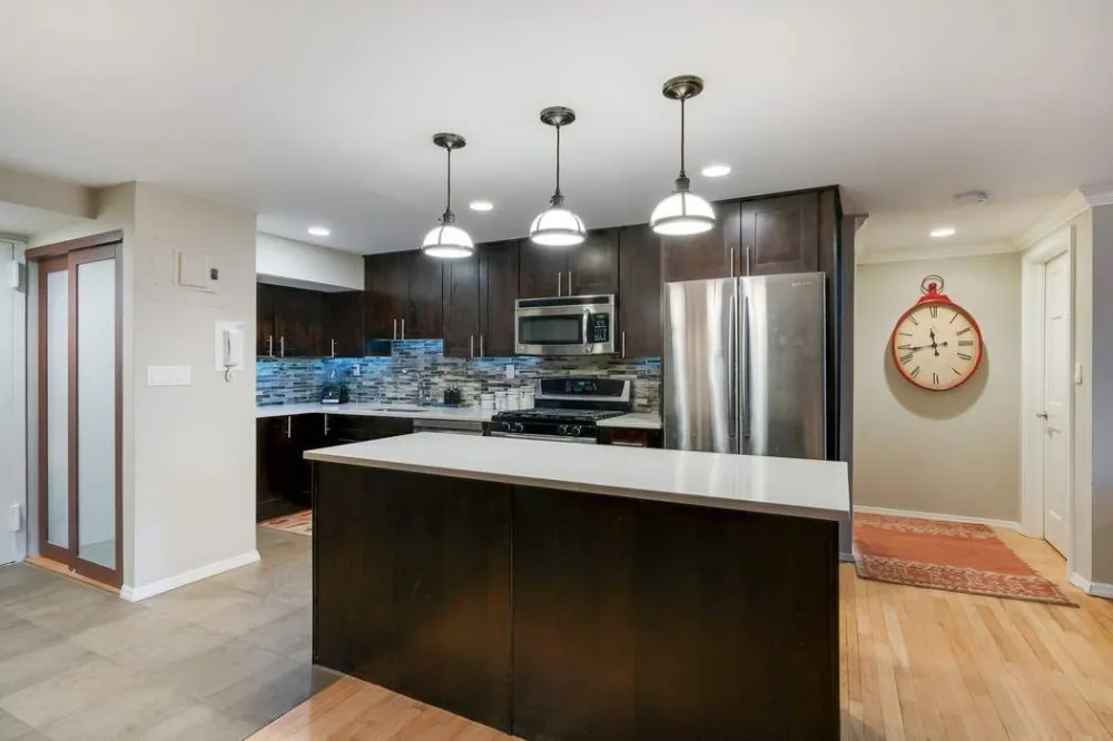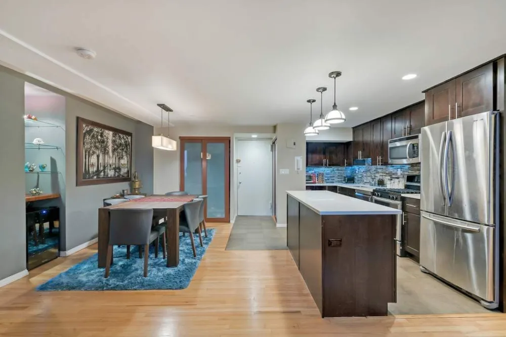 Enter this oversized, combined unit through the open kitchen and dining room and into the living room, which is perfect for entertaining and everyday living. The remodeled and open chef's kitchen features Caesarstone countertops, custom cabinetry with great storage, stainless steel appliances and a large island.