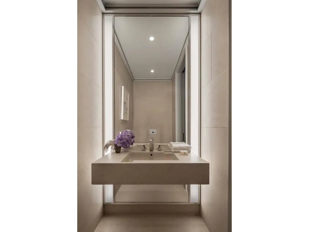 The primary suite offers east-facing views; a generous walk-in closet; and spa-like ensuite bathroom that blends tradition and originality. Elegantly appointed in polished Noir St. Laurent marble, high-honed Verona limestone, and polished Persian golden travertine with polished nickel Dornbracht fixtures throughout, the primary bathroom features two separate custom carved vanities with custom Thierry Despont-designed polished nickel automated mirrors, a cast iron Lefroy Brooks soaking tub, freestanding shower, radiant heated floors, private water closet with commode and bidet, and a large linen closet. A gracious secondary bedroom enjoys east-facing views and offers an en suite bathroom clad in high-honed Verona limestone with polished nickel Dornbracht fixtures. Completing the residence are a beautifully appointed powder room and a discreet utility closet with side-by-side washer and vented dryer. No detail has been overlooked, from the custom interior lighting design by Thierry Despont in collaboration with Schwinghammer, to the motorized Lutron solar shades throughout with additional blackout shades in each bedroom, to the supply of humidified and filtered fresh air throughout the home.