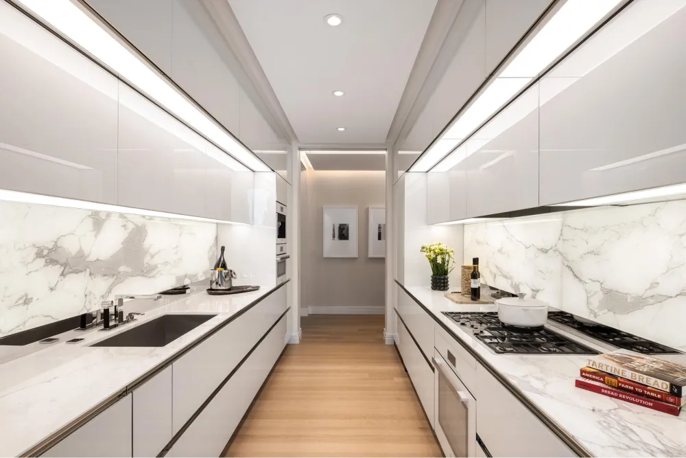 From the formal entry gallery, the generous corner living room is lined with floor-to-ceiling windows that artfully frame south- and east-facing views. The windowed custom kitchen by Thierry Despont for Molteni features polished statuary marble countertops and a back-lit statuary marble backsplash that complement back-painted glass cabinetry with polished nickel detailing and Dornbracht fixtures. The extensive suite of appliances by Miele and Sub-Zero includes a fully integrated refrigerator and freezer, five-burner cooktop with fully vented hood, integrated dishwasher, wall oven, speed oven, under-counter wine refrigerator, and integrated coffee maker.