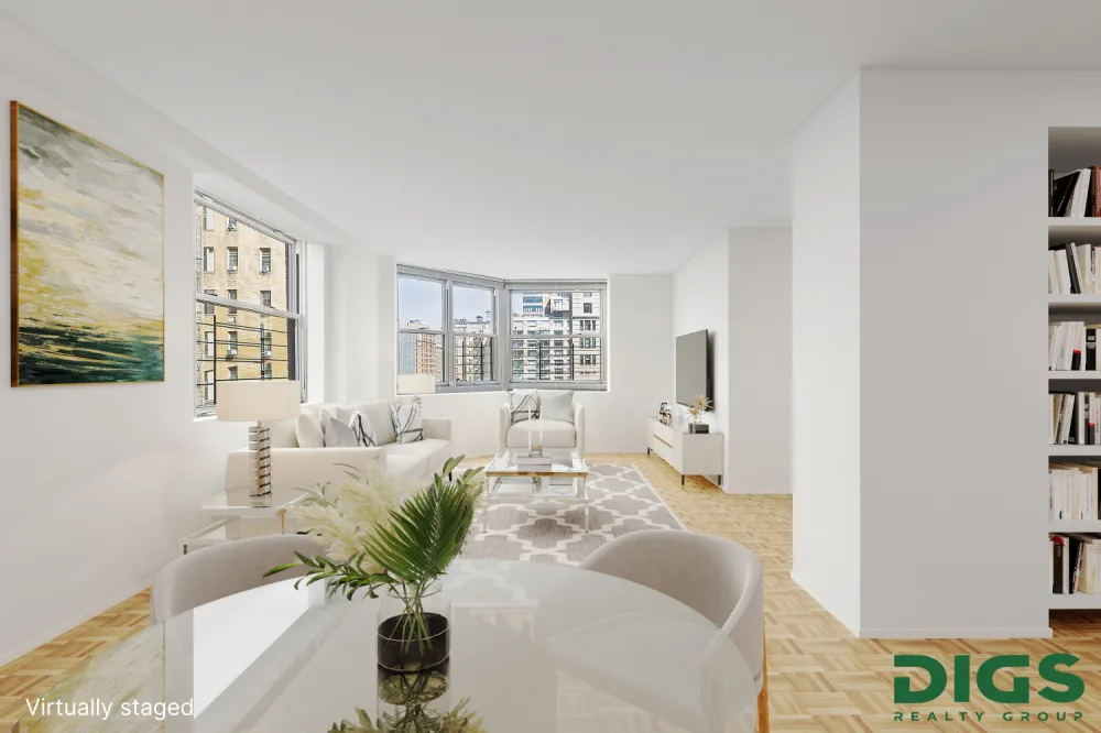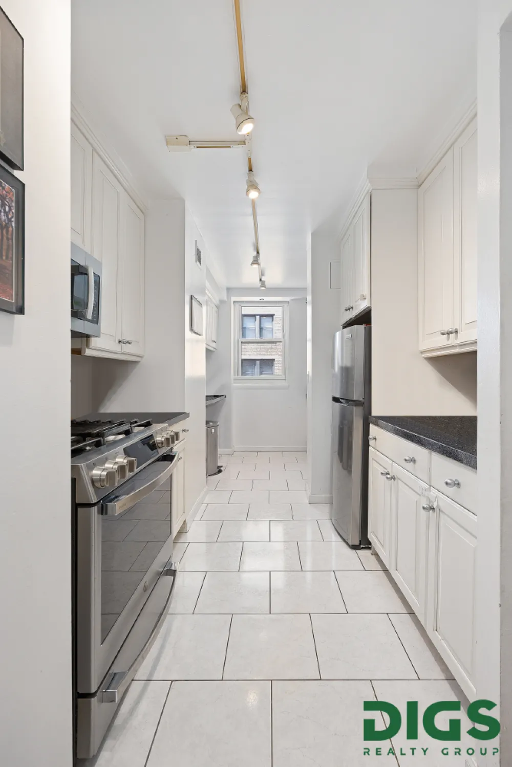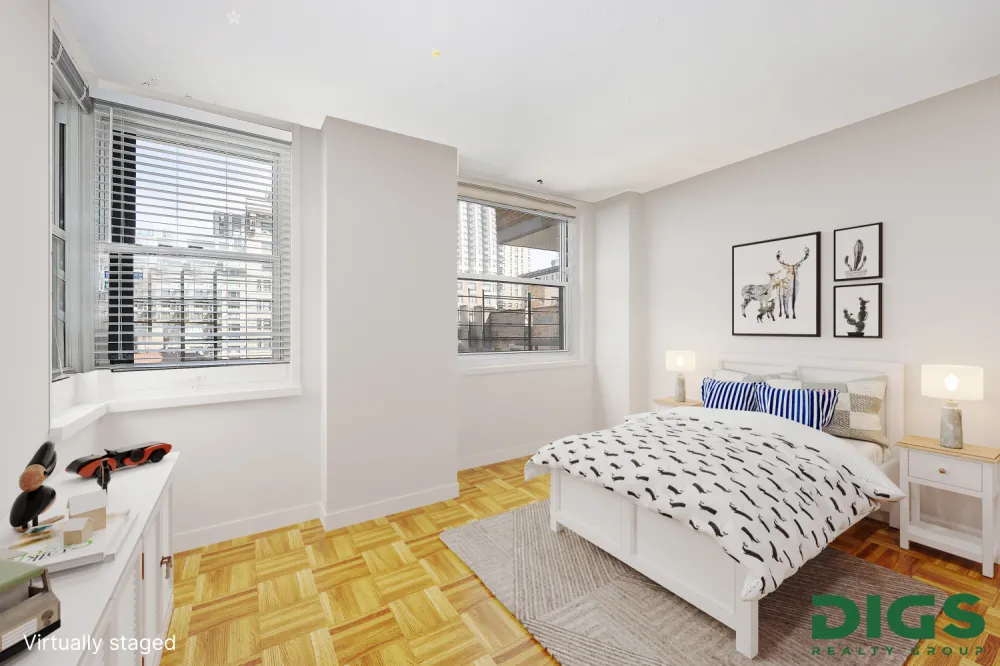 Bask in all day sunlight in this oversized 2br 2ba home. The apartment is pin-drop quiet and bright, clearing the neighboring buildings for open city views and total privacy. Natural light beams in all day through the apartment's 13 large windows. Storage space is abundant, with an oversized walk-in utility closet off the kitchen, generous bedroom closets, and built-in shelves. A stacked washer/dryer is conveniently tucked out of the way between the kitchen and the walk-in closet.