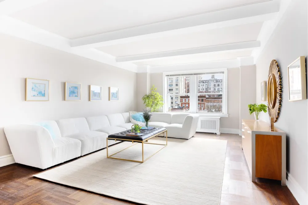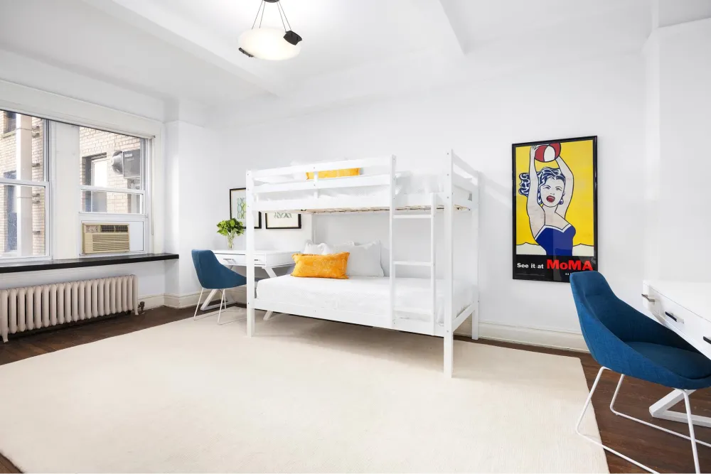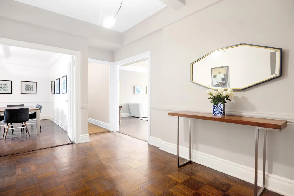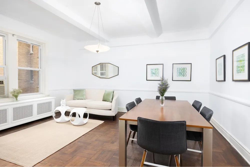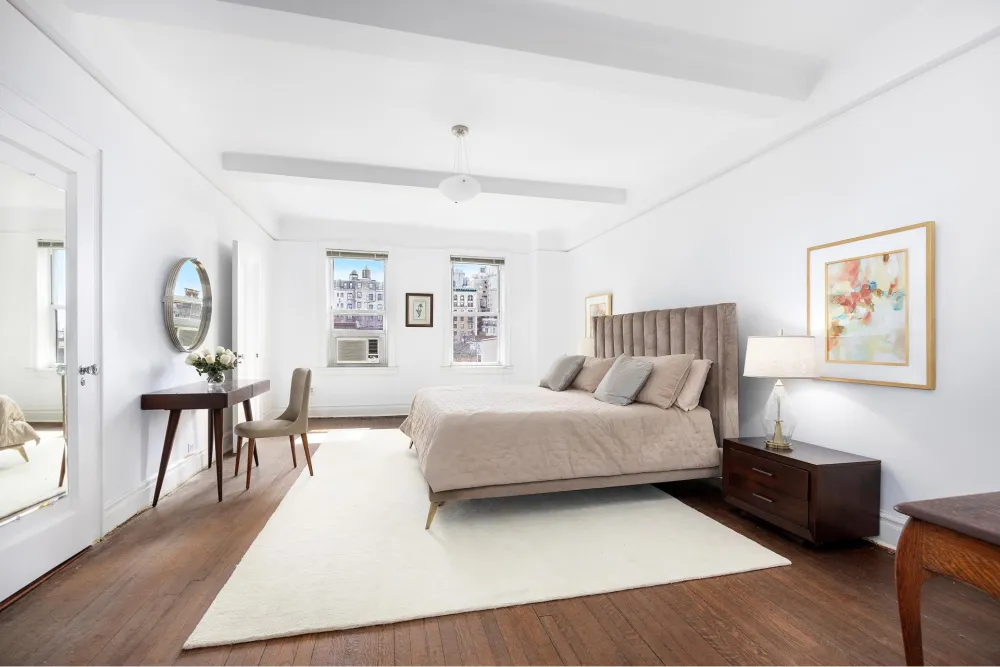 90 Riverside Drive is a majestic prewar co-op that is pied-a-terre and pet-friendly . There is a gym, basketball hoop, playroom, roof deck, deeded storage bins, and two bike rooms. The phenomenal staff offers white-glove service with doormen and, of course, a live-in resident manager.