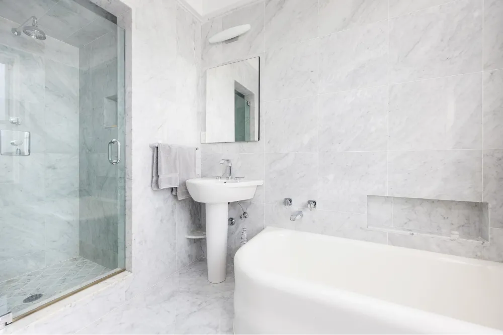 Down a long hallway are the two very spacious and sunny bedrooms, both with en-suite, windowed bathrooms. The primary marble bathroom has a glass-enclosed stall shower and a separate soaking tub.