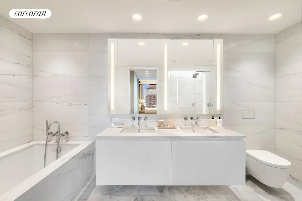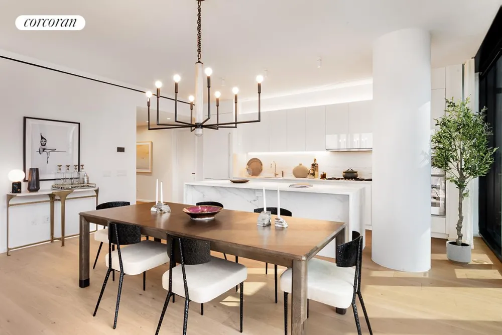 Designed by Meier Partners, the residence interiors are a striking contrast to the black glass exterior, reflecting a white color palette. Living spaces are immersed in natural light radiating through the floor-to-ceiling windows. White oak floors are found in all residences and open kitchens boast white Calacatta Lincoln marble counters, Dornbracht fixtures and Gaggenau appliances clad in custom-crafted Italian white lacquer. Each residence is equipped with a built-in Crestron smart home system that regulates temperature, lighting, and motorized window shades. These functions can be seamlessly controlled by residents through any iOS or Android device.