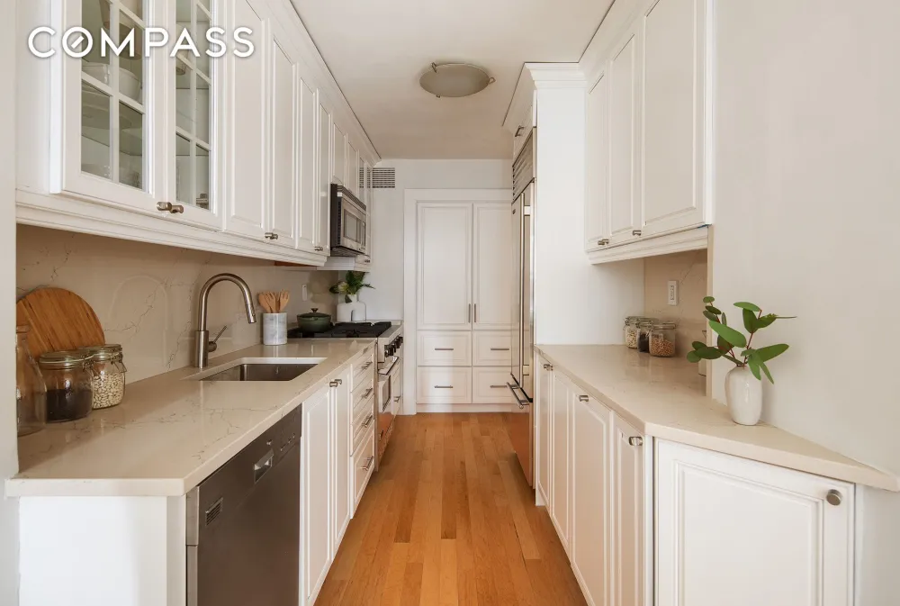 This spacious, southern exposure unit offers a convenient open floor plan that separates living from sleeping areas and a newly renovated kitchen with Cambria quartz countertops and backsplash, Viking range, Sub-Zero refrigerator and Miele dishwasher, and excellent cabinet and counter space.