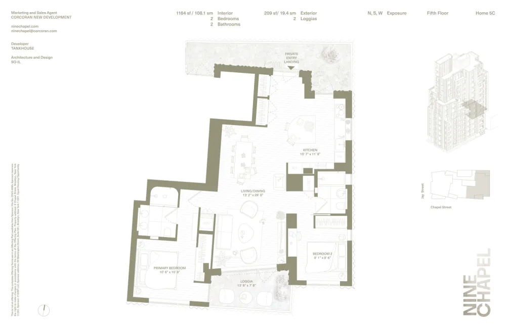 Arrival into Nine Chapel is via a landscaped walkway into a double-height lobby. The residences each have a dedicated, covered stoop-like entry landing, a functional extension of the homes" interiors. The innovative layouts provide each home the benefit of a corner unit, with every residence offering at least two exposures and abundant natural light through large picture windows.