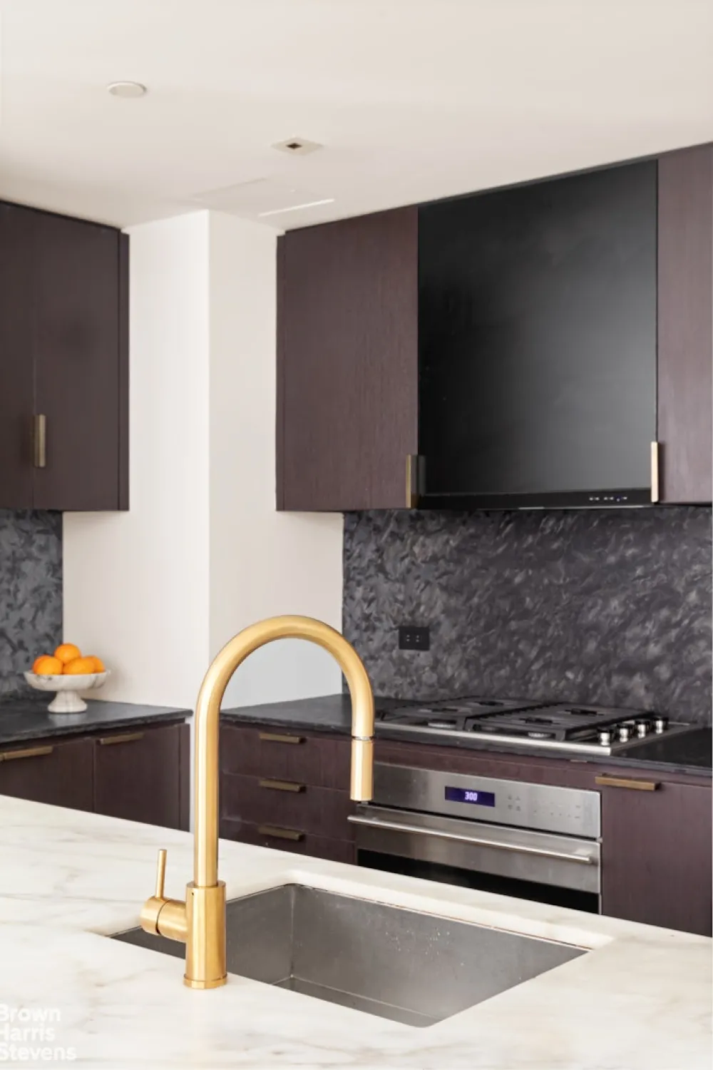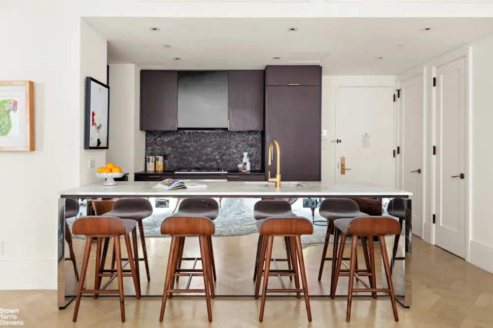 This Paris Forino-designed two bedroom, two bath gem features an unusually large, combined living and dining room that measures over 19 feet in each direction. That measurement does not include the expansive open chef's kitchen with bespoke details. The kitchen is thoughtfully designed with honed white marble and textured charcoal granite countertops and backsplash, espresso-stained oak cabinetry, finished with brushed living brass hardware and a full suite of Wolf, Sub-Zero and Bosch appliances. The unit provides every modern convenience and efficiency, including central air, supplemental heat near the windows, and an in-unit Bosch washer dryer.