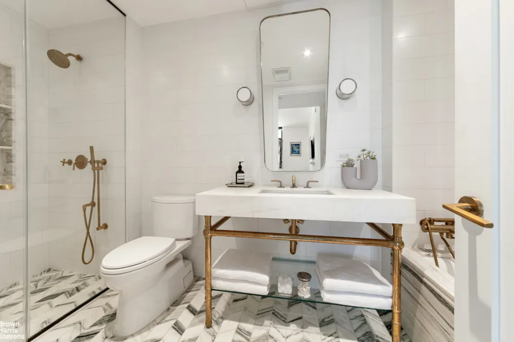 Exquisite, custom design and best-in-class finishes are the hallmark of any Paris Forino creation, and this home is no exception, with solid white oak herringbone wood flooring and crown moldings throughout. Four expansive and sound-attenuated casement windows and generous 10-foot ceiling heights make this apartment a peaceful, bright, and airy masterpiece. The primary suite is a serene retreat, including a large walk-in closet and a luxurious ensuite bath, clad in white Dolomiti marble and bookended by separate walk-in shower and deep soaking tub with brushed brass fixtures by Waterworks and heated floors. The second bath has not been overlooked, with a walk-in glass shower enclosure, geometric tile, living brushed brass Waterworks fixtures, marble details, and graceful proportions.