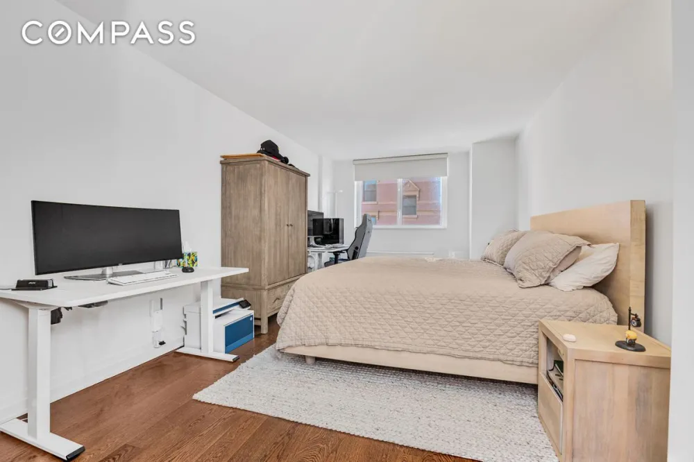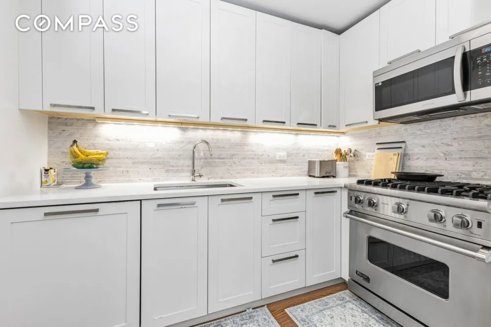 This impressive 1,076-square-foot home welcomes you with a stunning expanse of north-facing windows framing classic Upper East Side city views. The oversized great room is perfect for both relaxing and entertaining, featuring 5-inch-wide oak flooring, soaring ceilings, and expansive art walls. The open-concept kitchen strikes the perfect balance of form and function with custom cabinetry, Caesarstone countertops, and Carrara marble backsplashes, surrounding high-end appliances including a Viking range, built-in microwave, and panel-front Sub-Zero refrigerator and dishwasher.