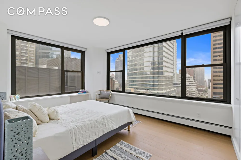 The second large corner bedroom has two exposures, surrounding windows and a wall of closets.