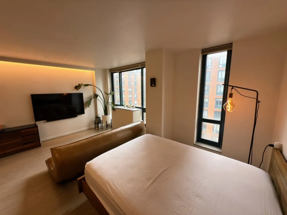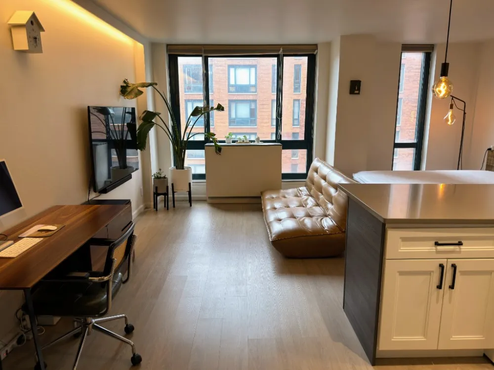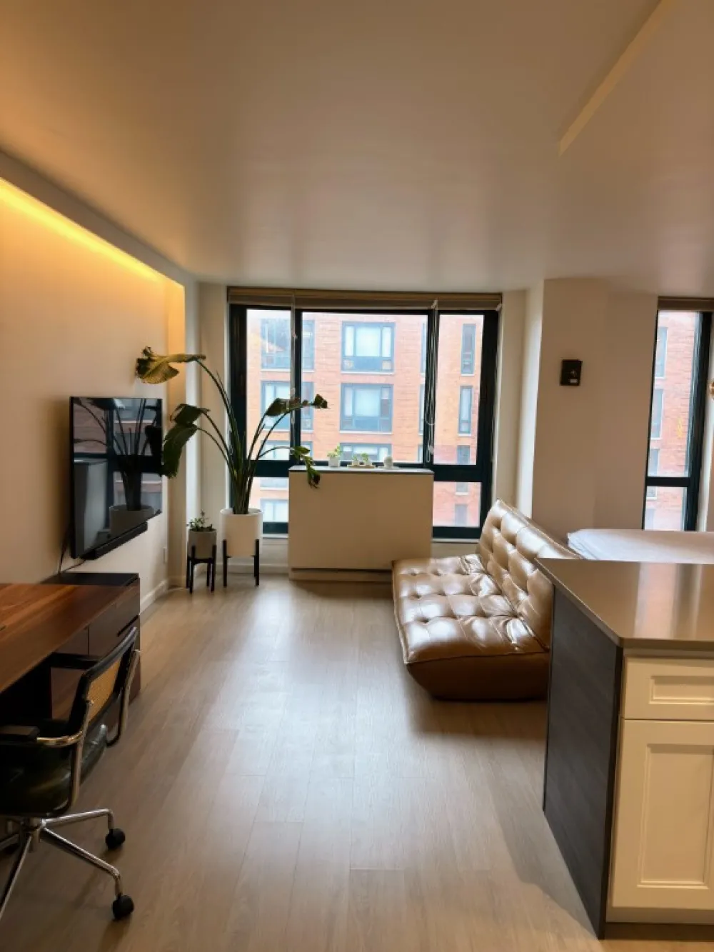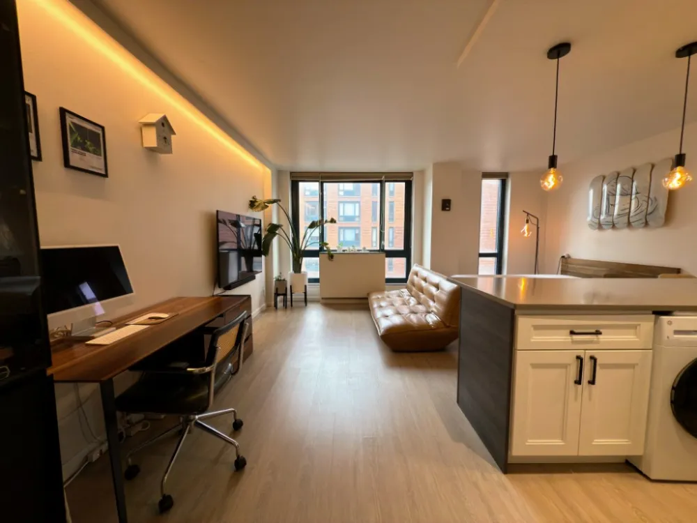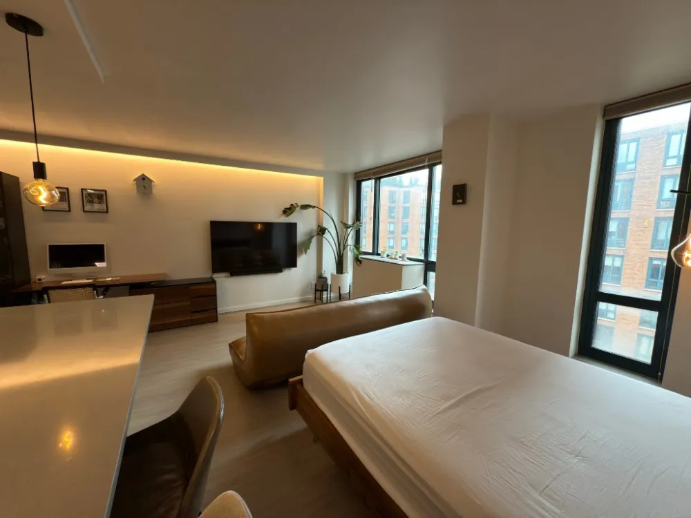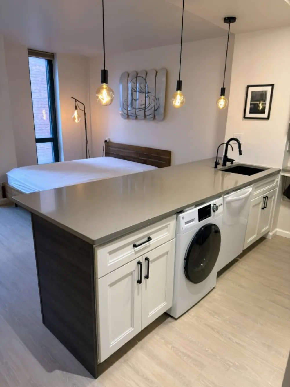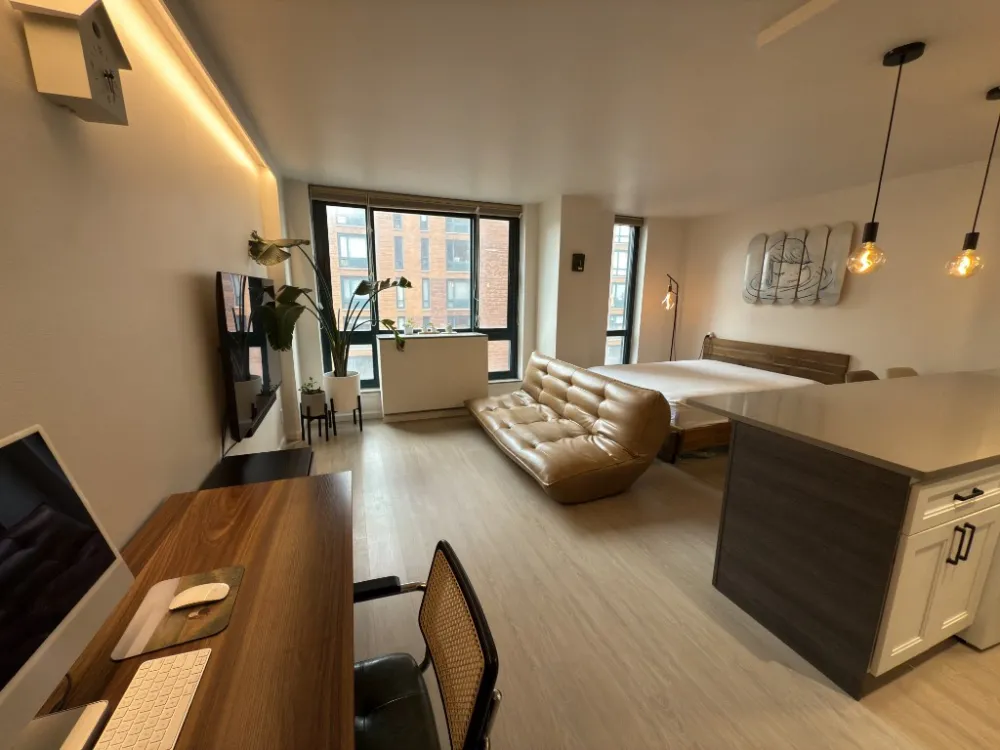 - **Open Kitchen:** Outfitted with new, state-of-the-art appliances, an InSinkErator disposal, and an expansive large countertop a rare find in studio apartments.