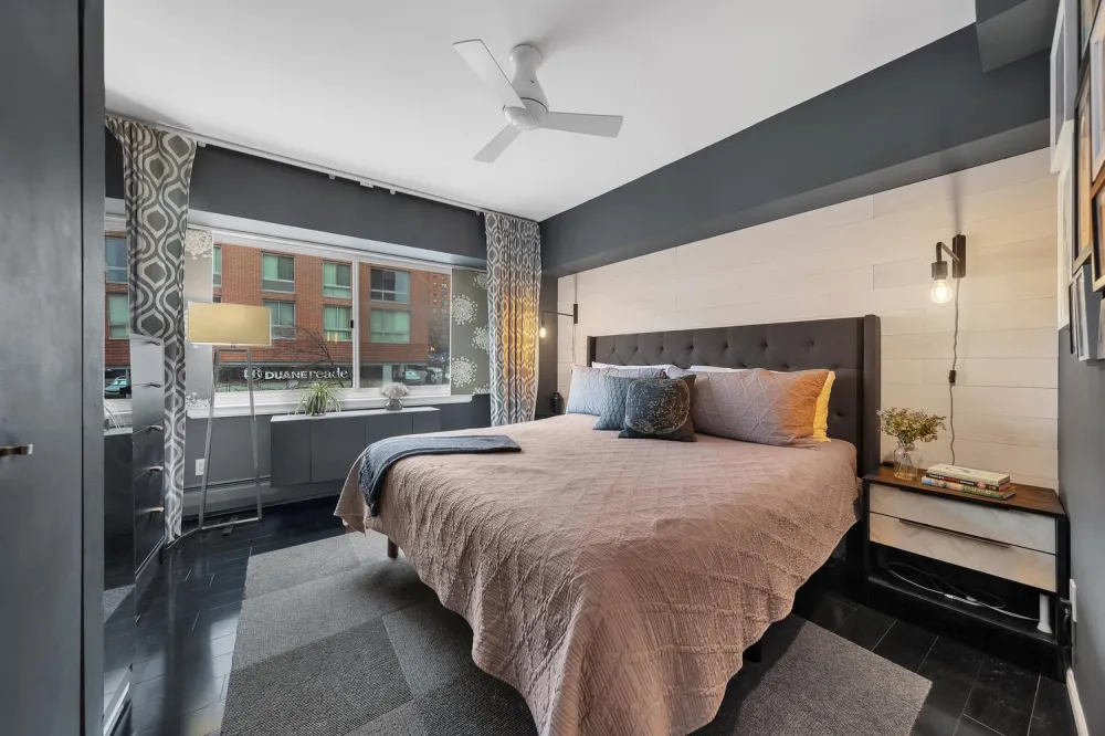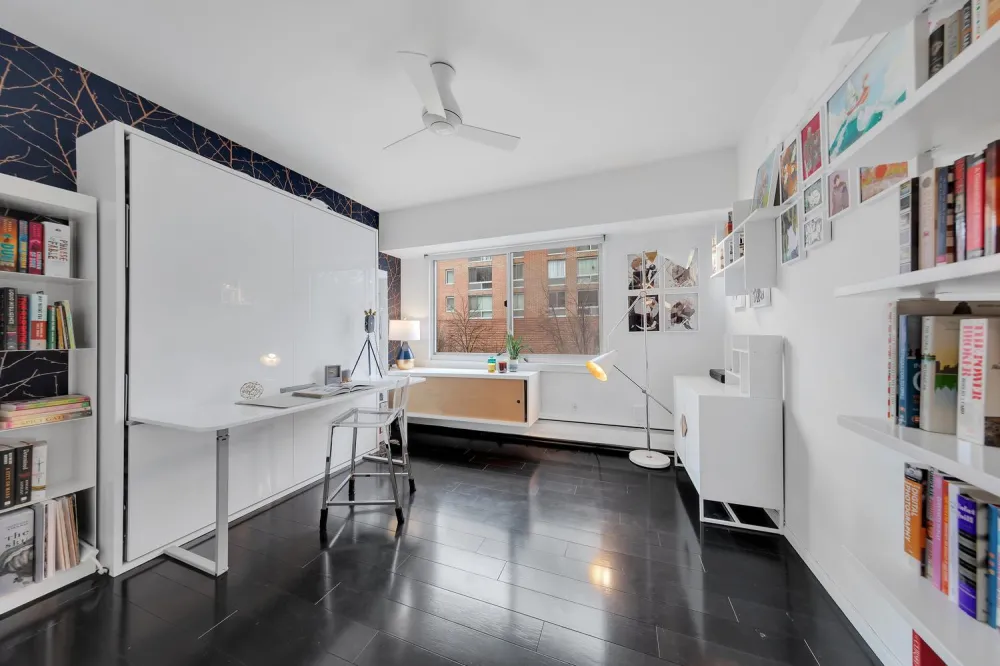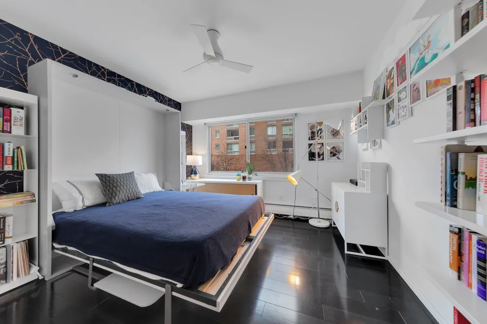 Both bedrooms, tucked on one side of the apartment opposite the entertaining spaces, are spacious and bright. The primary has an en-suite half-bath, and the second bedroom comes equipped with a custom Expand Furniture Murphy bed, an elegant way to maximize versatility within the space.