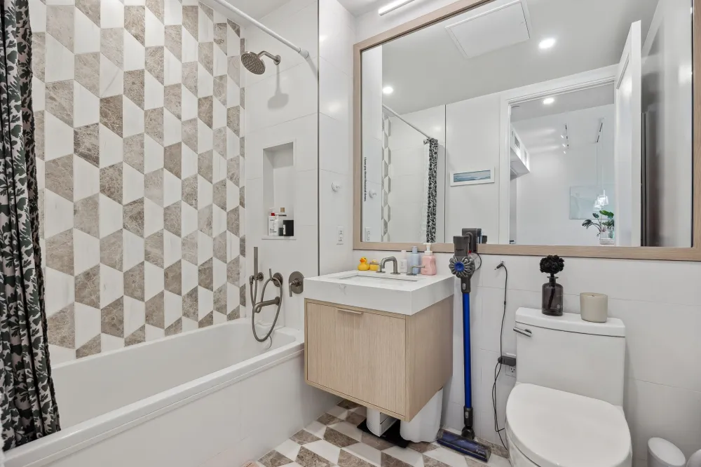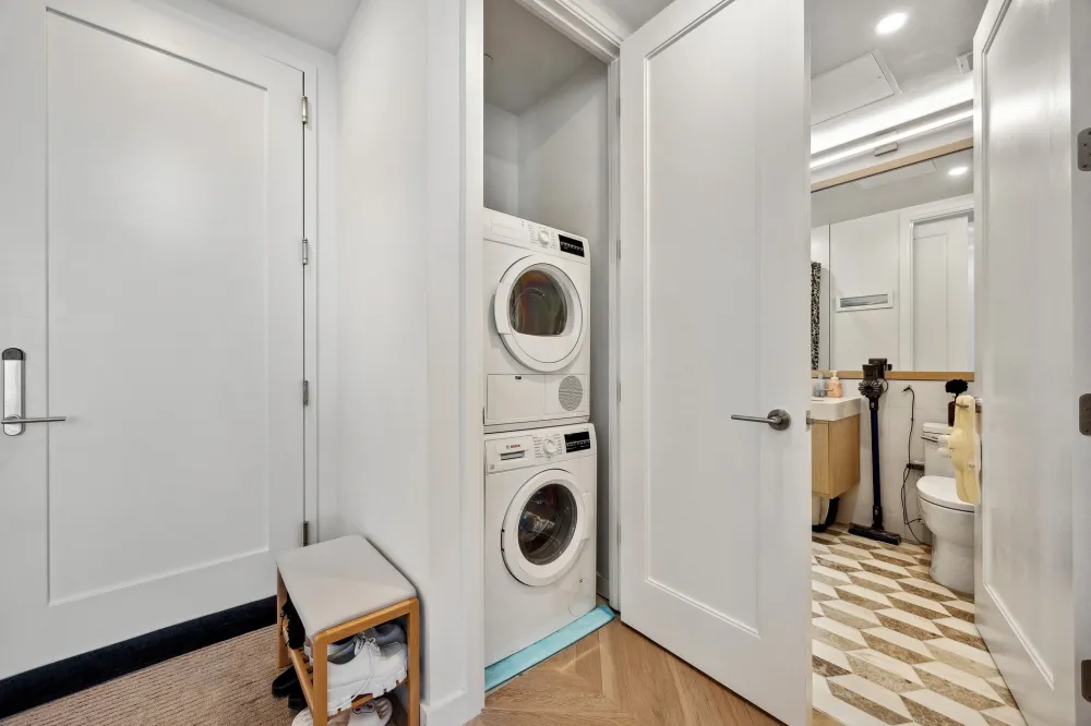 The bathroom is finished with Italian Porcelanosa stone tiles , a Carrera Caesarstone vanity. The unit also includes an in-unit washer and dryer , two closets, and a welcoming foyer with ample storage.