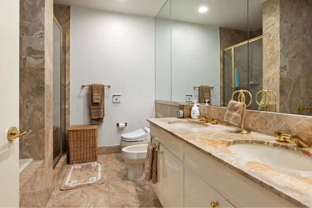 The residence features gorgeous and rich herringbone floors, and a perfect split bedroom layout. The extraordinarily expansive open living room is perfect for entertaining intimate or large gatherings. The spacious Chef's kitchen has an eat- in area and showcases beautiful windows with stunning panoramas of the city skyline. Other features include Multi-zone Central Air and Heat and full size washer/dryer. The primary bedroom is its own palatial grand suite, featuring 6 closets and a spa like marble bath.