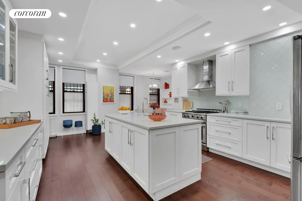 The fully outfitted open chef's kitchen features a huge center island, wonderful for entertaining, and an abundance of cabinet storage including pull-out shelving. There is a huge walk-in pantry that is currently configured as a home office. An abundance of sleek counters provides plenty of space to work balanced by glass tile backsplash. Additional features include high-end stainless appliances including a Miele dishwasher, Samsung refrigerator, and Capitol gas range oven, as well as a deep Shaw's farm sink. A gorgeous custom built-in breakfast banquette completes the space.
