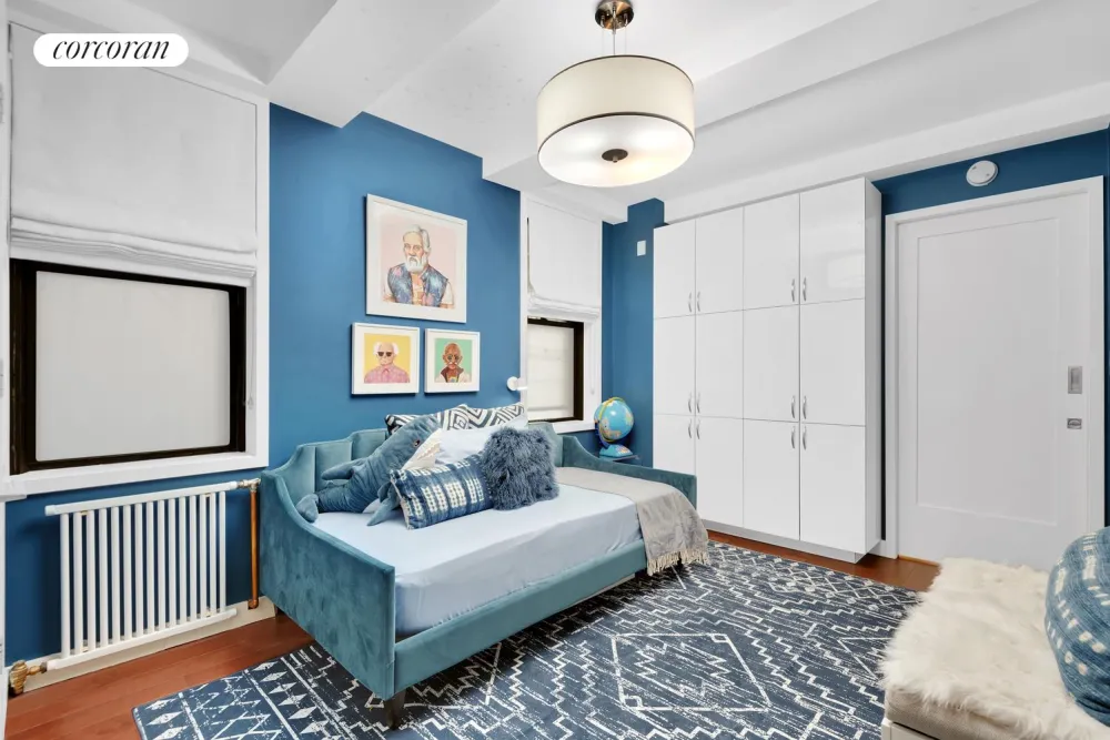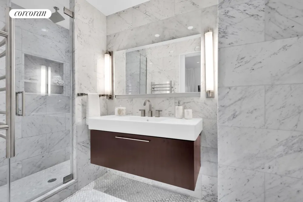 The very spacious, corner primary suite features two custom walk-in closets and a stunning en-suite bath bathed in marble with herringbone marble heated floors, heated towel rack, Duravit vanity, and walk-in marble shower. The second bedroom features a huge, deep custom closet, and en-suite marble bath with radiant heat floors and deep-soaking tub. Access from both the bedroom and the living room, it serves as a great guest bath or shared bath for the third bedroom. The third bedroom is configured as a guest room/home office with open shelving and a large closet.