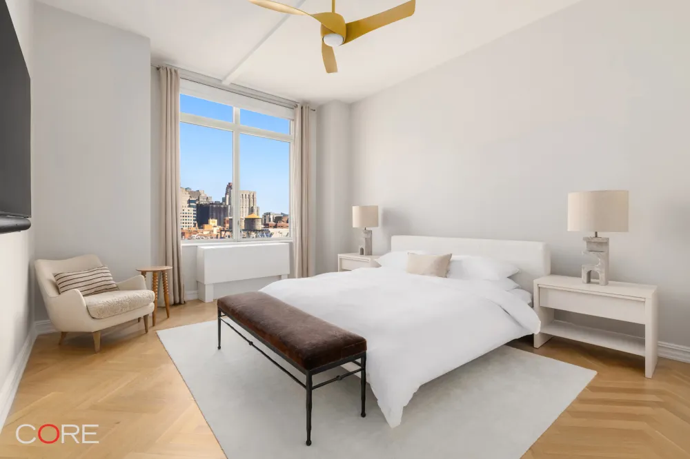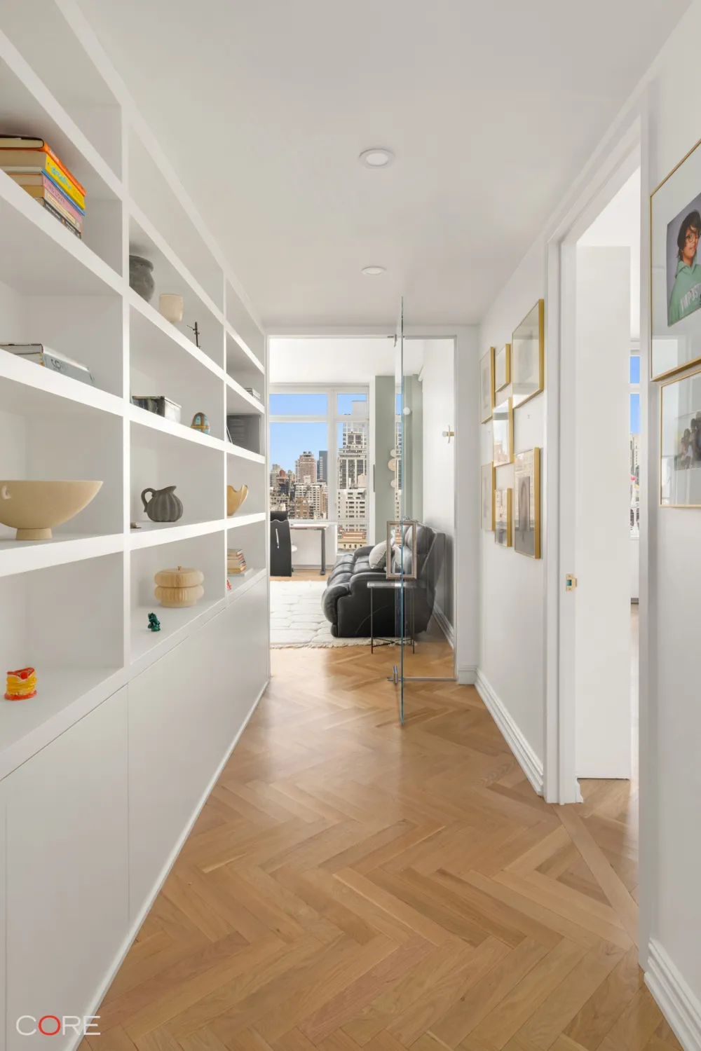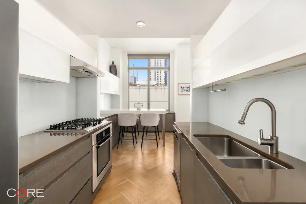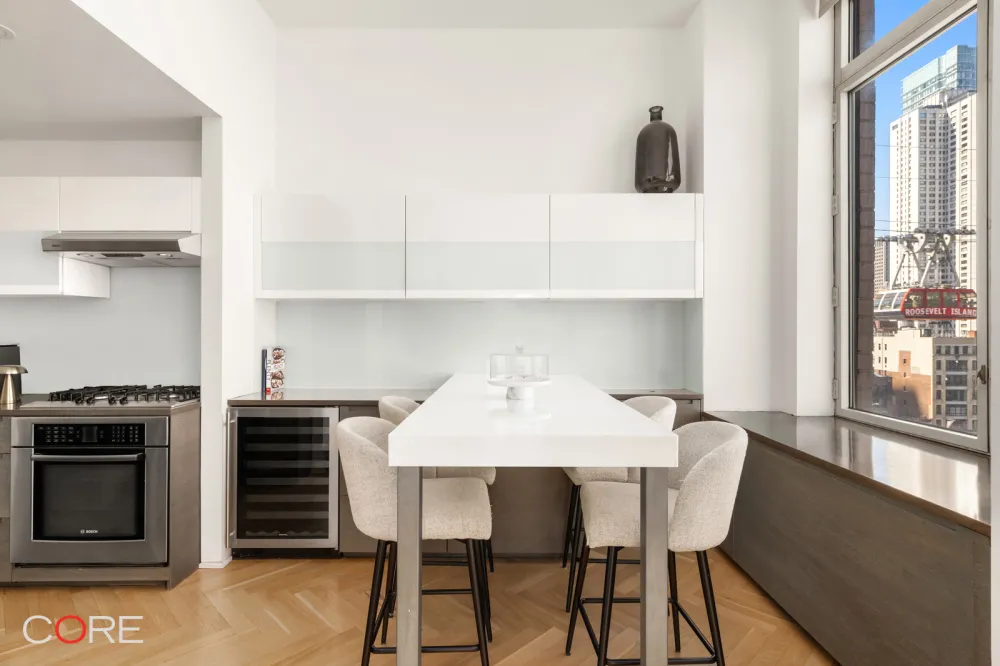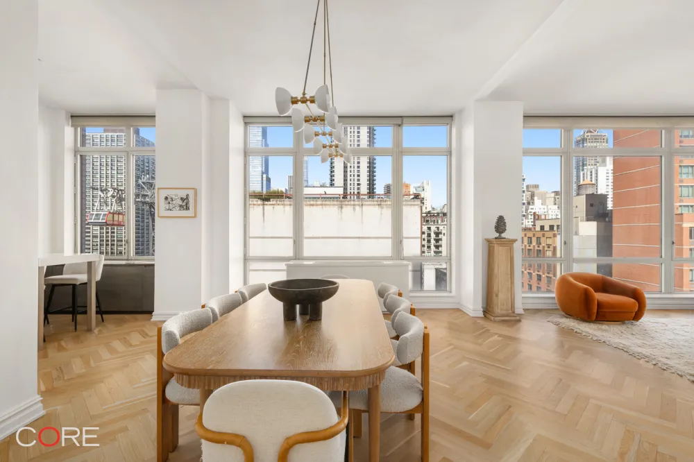 Soaring 11-foot ceilings and floor-to-ceiling windows bring in natural light and open city views, enhanced by brand-new herringbone wood floors. The expansive living and dining areas flow into a custom eat-in kitchen with sleek cabinetry, pull-out pantries, and integrated storage.