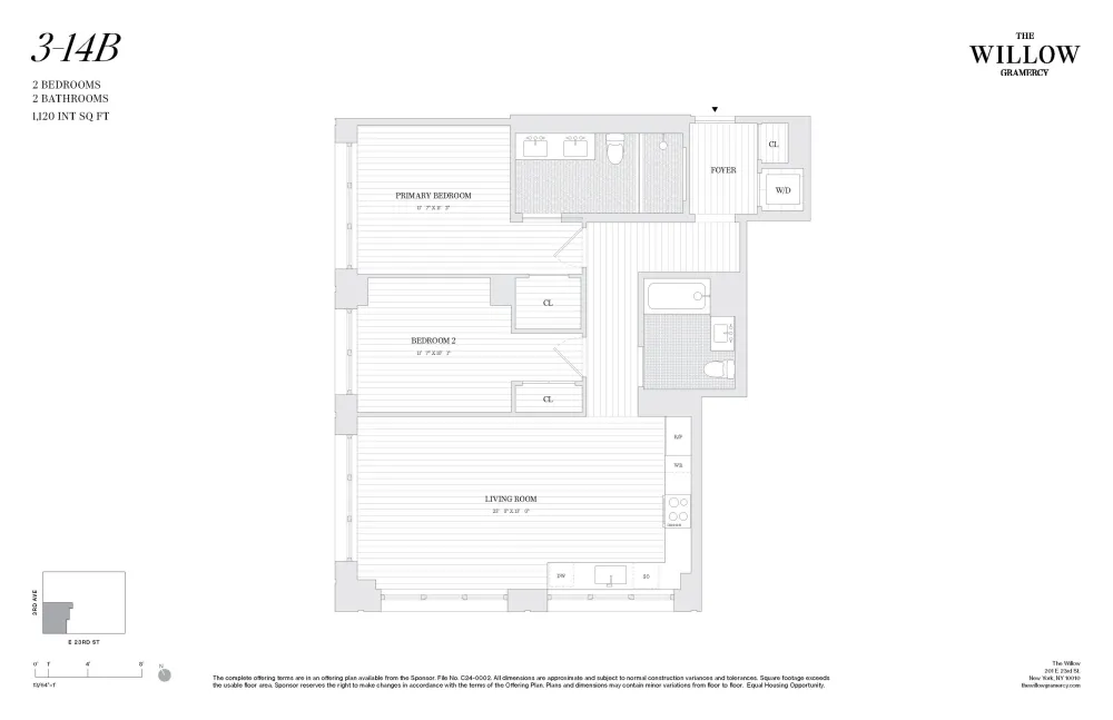 CLOSINGS COMMENCE THIS SPRING. 65% Sold. Residence 14B is a gracious and well-appointed, two-bedroom, two bathroom corner apartment with south and west exposures. A private foyer leads to the open kitchen and living space, surrounded by arched windows that fill the apartment with natural light and highlight the elegance of the wide-plank white oak flooring. The primary bedroom suite feels private and luxurious with generous closet space and a double vanity in the bathroom. A full size washer and dryer complete this special home.