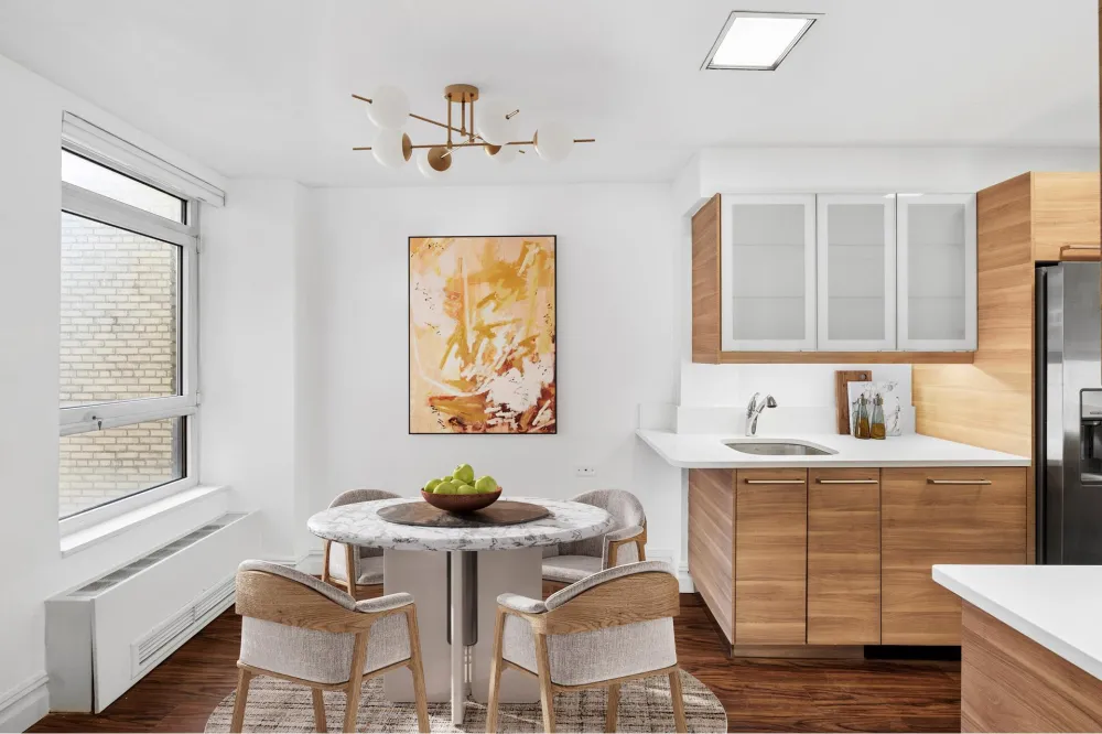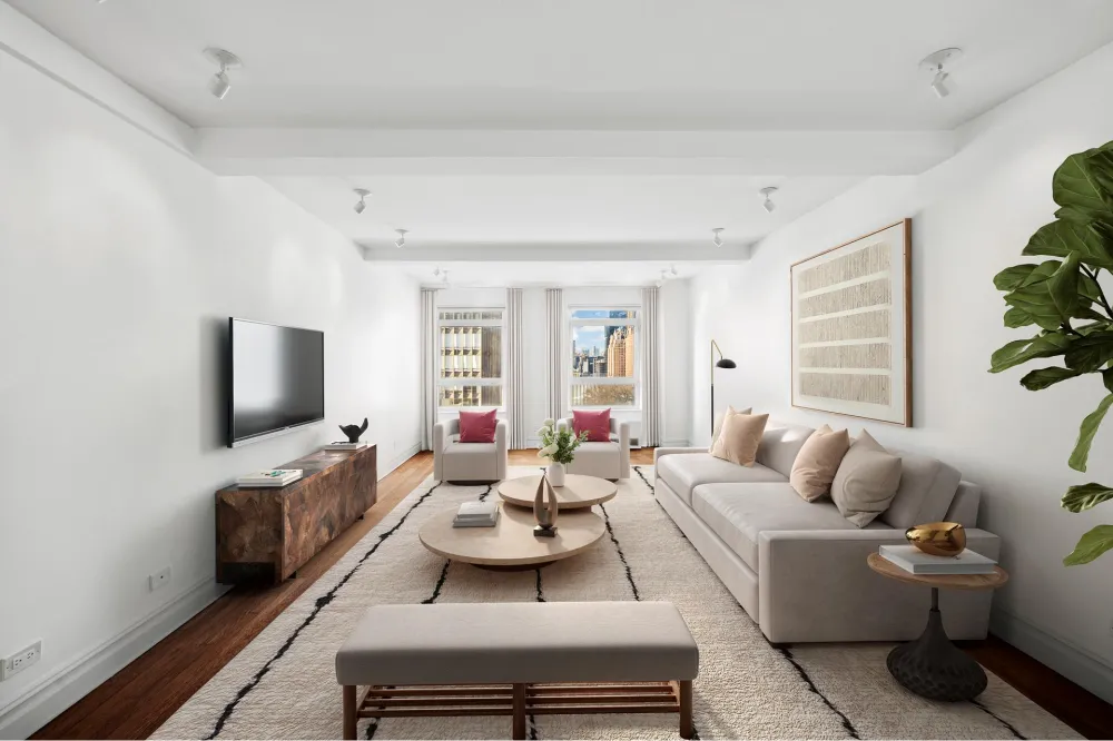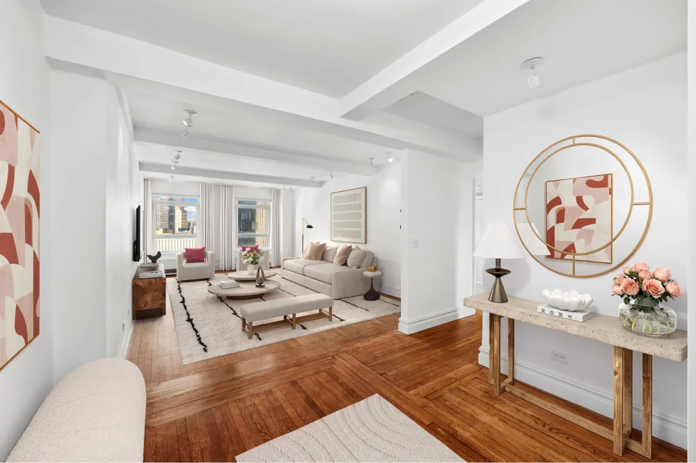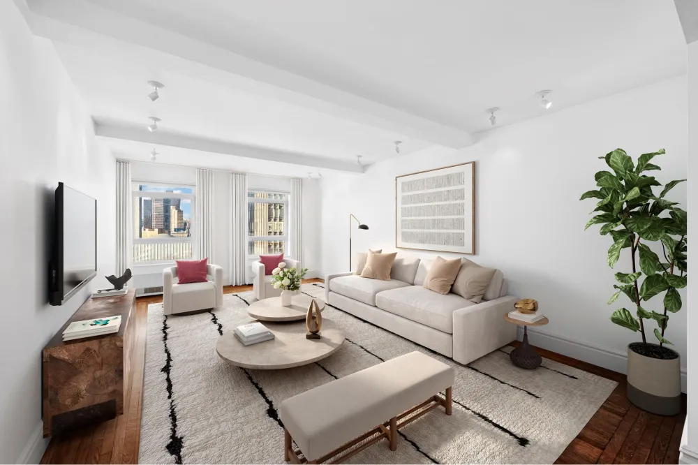Welcome to Residence 13E, a beautifully renovated prewar residence in the esteemed 2 Beekman Place cooperative, designed by the legendary Rosario Candela. This exquisite two-bedroom, two-bathroom home offers an expansive layout, filled with natural light via coveted southern exposures. The spacious living room, adorned with high beamed ceilings and classic white oak floors, presents stunning open city vistas, including the iconic United Nations headquarters and its lush gardens, alongside serene East River views.