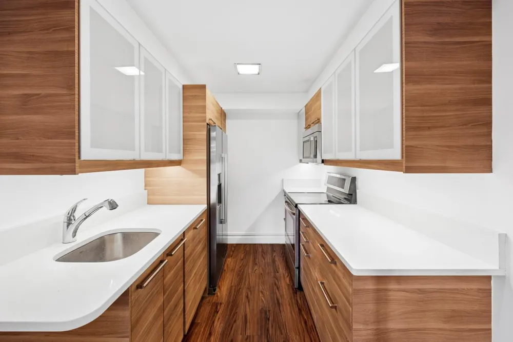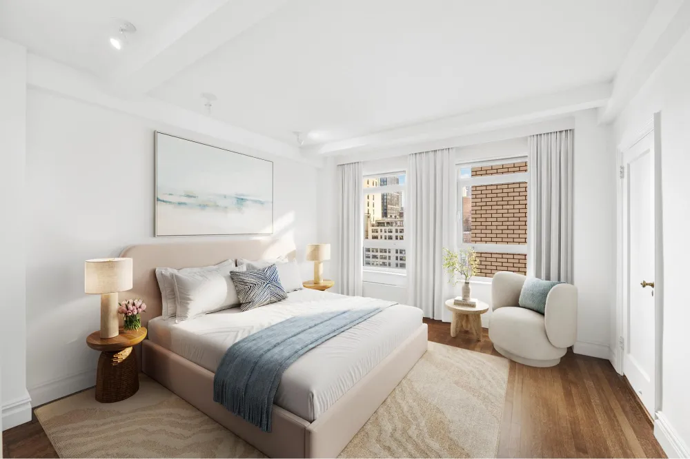 Both bedrooms are thoughtfully positioned to maximize light and privacy. The generously sized primary suite is a true retreat, offering abundant closet space, extraordinary natural light, and iconic city skyline and river views through large south-facing windows. The large secondary bedroom, featuring an en-suite bath and exposures to the north and west, is well suited to function as a second bedroom and/or home office. Abundant storage throughout ensures effortless organization and functionality.