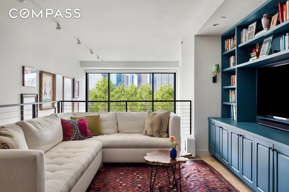 The entry foyer welcomes you with a spacious coat closet and an elegant marble powder room. Beyond, the open mezzanine has been thoughtfully customized as a comfortable den, with custom millwork, abundant storage options, and a dedicated area for work or study. This flexible space offers a cozy retreat while overlooking the lower-level entertaining areas, all set against a stunning backdrop of Lower Manhattan and the lush park below.