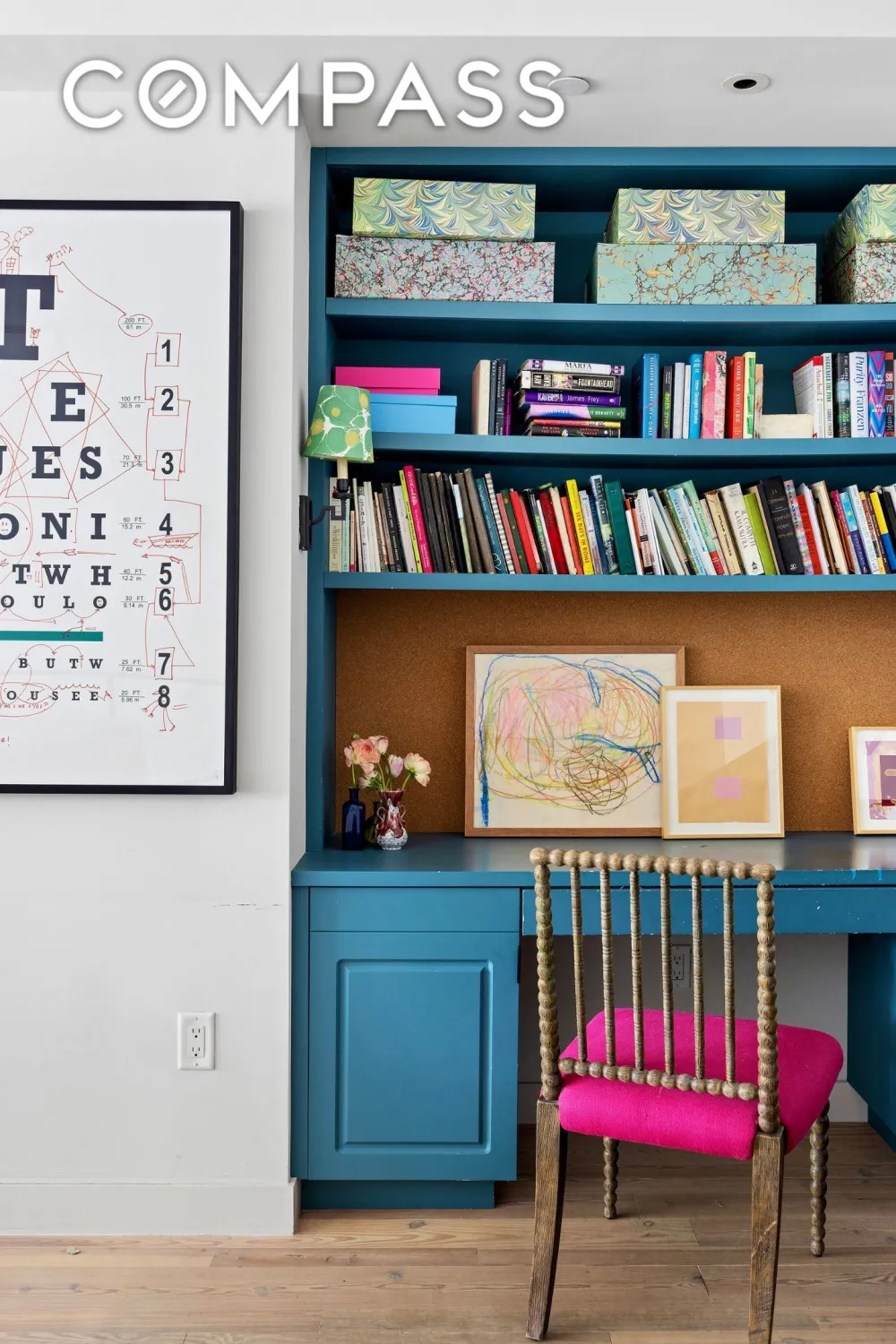 The chef’s kitchen is outfitted with top-of-the-line Gaggenau appliances, custom walnut millwork, and luxurious Calacatta Tucci marble. Adjacent to the kitchen, a cozy dining nook offers the perfect spot for intimate meals or casual gatherings. Additionally, the owner thoughtfully added extra storage beneath the stairwell, providing a smart solution for keeping kitchen and entertaining essentials organized.