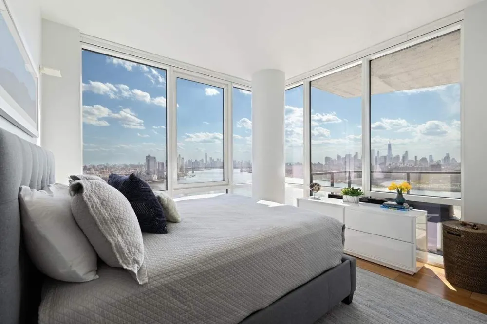 A welcoming entry foyer with a large coat closet leads to the apartment’s 30-foot-long east-west axis, culminating in the living room’s breathtaking west-facing window wall. The spacious secondary bedroom includes a full wall of custom built-ins, featuring a hidden Murphy bed and ample storage. The primary bedroom boasts corner windows with sweeping views of the river and Brooklyn. The ensuite bathroom is a retreat with marble mosaic floors, a walk-in shower, a walnut vanity with dual sinks, and an oversized medicine cabinet. The secondary bathroom features marble tile and a full tub and shower.