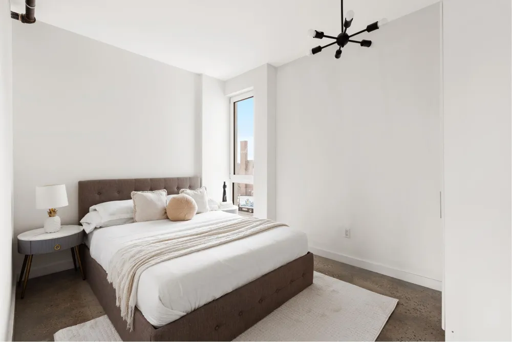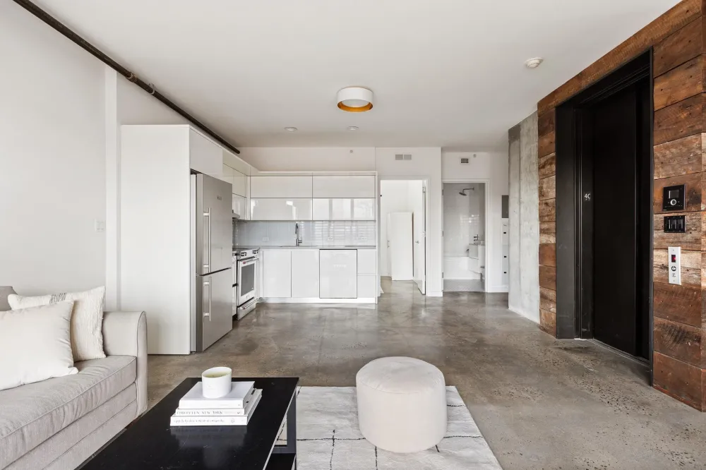 This bright space is outfitted with beautifully polished concrete floors, high ceilings, reclaimed wood, and triple-paned floor-to-ceiling windows.
