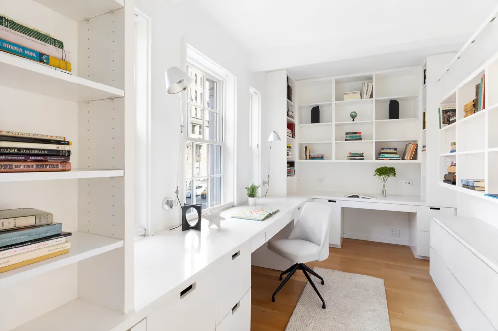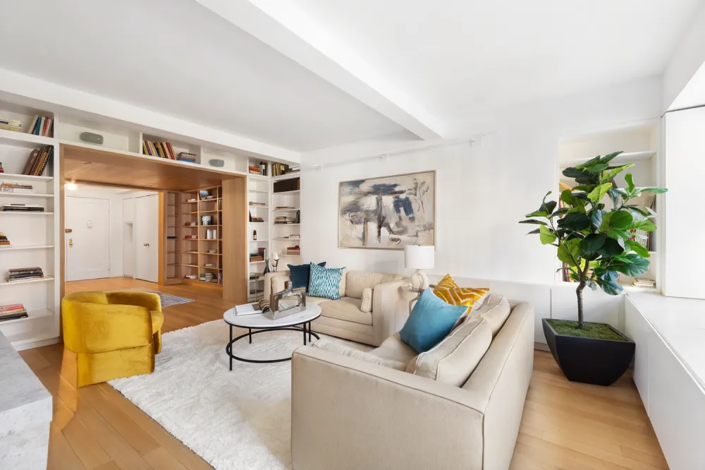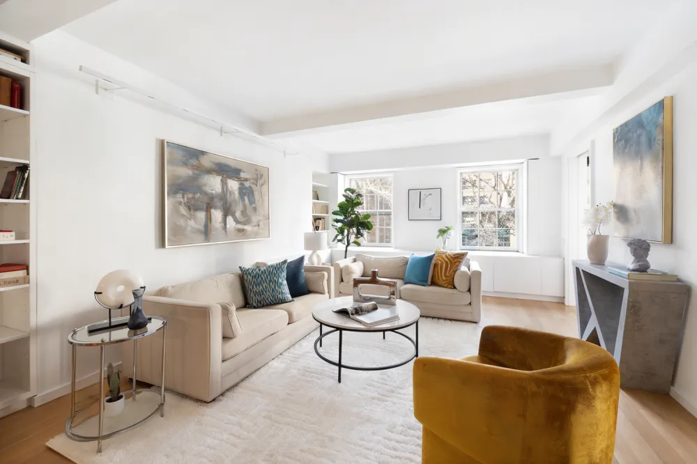 Discover an extraordinary opportunity to own a sophisticated 2-bedroom plus office, 2-bathroom residence at 51 Fifth Avenue- a full-service, pre-war cooperative nestled in the heart of Greenwich Village. Thoughtfully redesigned by internationally acclaimed theater critic and scholar Elinor Fuchs, this home radiates elegance, seamlessly blending timeless charm with modern convenience.Upon entry, a striking wood-paneled gallery lined with custom bookshelves and recessed lighting sets an intimate yet open tone, leading into a spacious living room. Beamed ceilings throughout add architectural character, while custom built-in storage maximizes space without compromising design.