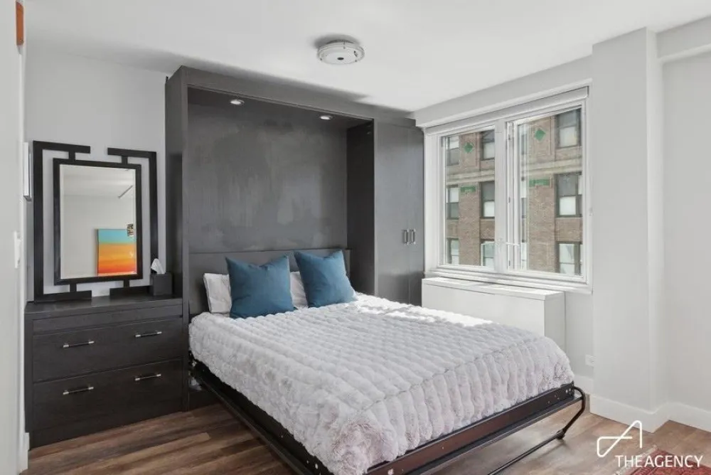 The living quarters have been designed for both comfort and aesthetic appeal, featuring a wealth of closet space for optimal organization. The thoughtfully arranged layout affords distinct areas for dining, relaxation, work, and rest. The sleeping alcove is complemented by a built-in Queen Size Murphy Bed and custom designed shelving and hanging space. A dedicated dressing area featuring generous custom closets leads to a luxuriously renovated bathroom.