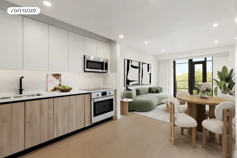 This elegantly designed 936 square foot two-bedroom, two-bathroom condominium residence offers western exposures. Each residence features floor-to-ceiling oversized windows, wide-plank white oak flooring throughout, recessed lighting, high ceilings above 8', and an in-unit washer and dryer.