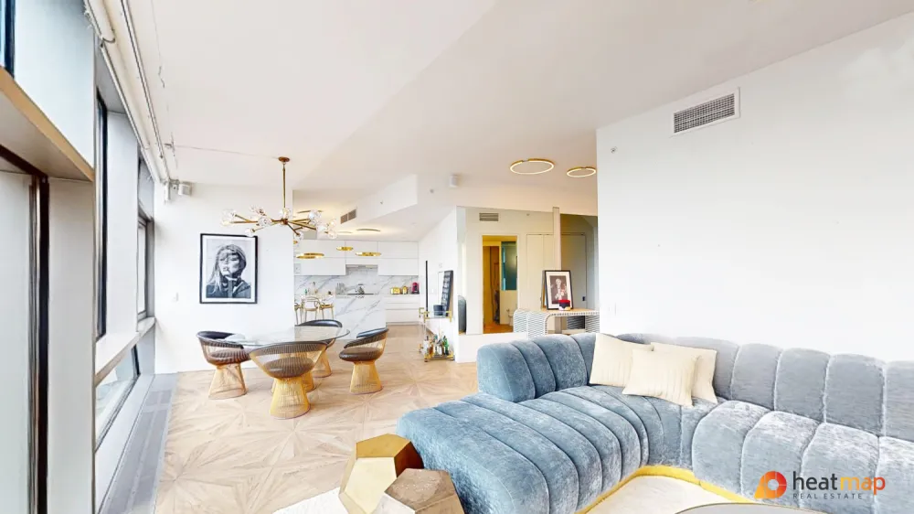 Floor-to-ceiling windows, soaring ten feet high, frame sweeping views of the Hudson River and downtown Manhattan to the south and west, offering a captivating backdrop to everyday life. The state-of-the-art kitchen, crafted by Cesar Cucine, features bespoke lighting, a porcelain island, and premium appliances from Bosch, Thermador, and Viking, ensuring a culinary experience beyond compare. Newly renovated bathrooms exude opulence with porcelain surfaces, Kohler tubs, and pristine sanitary ware.