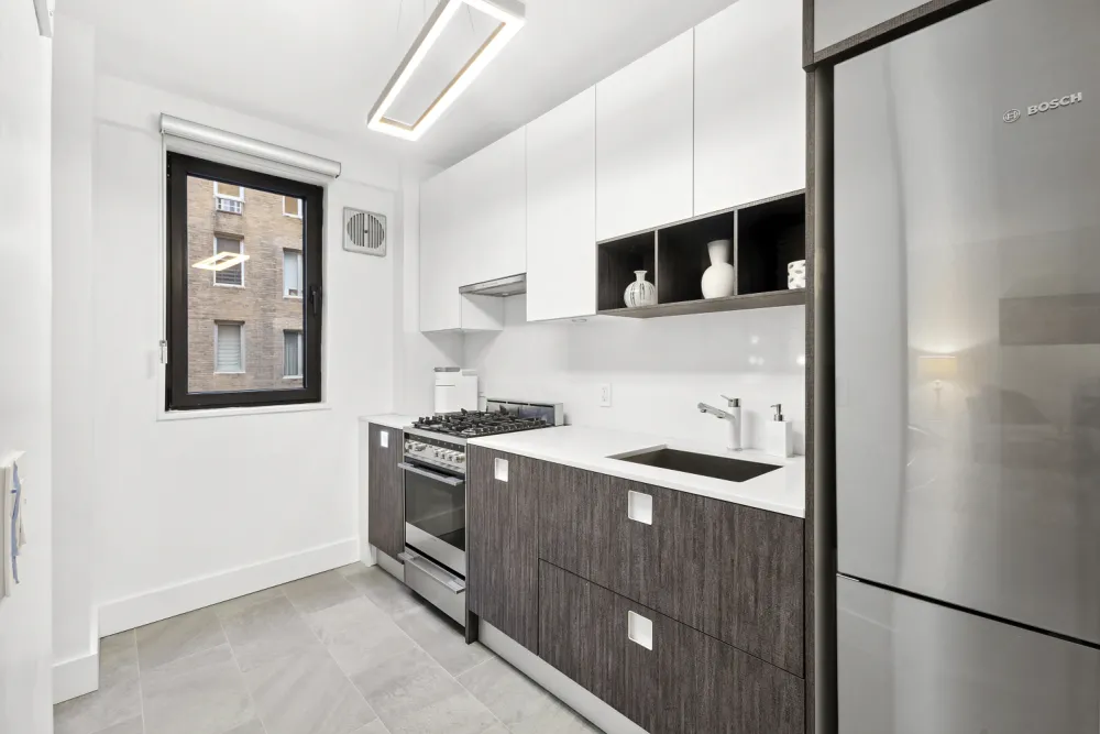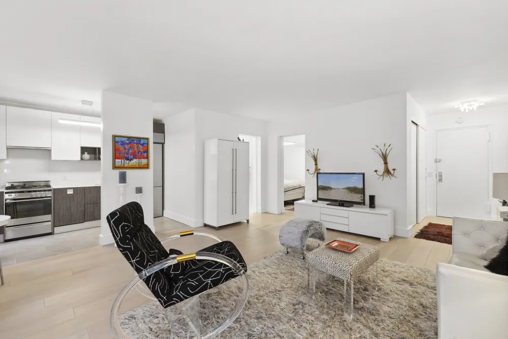 Upon entering the apartment, you immediately appreciate the modern design, with each detail thoughtfully curated to create an atmosphere of understated elegance. Custom window treatments from The Shade Store provide the perfect balance of privacy and natural light, while the distinctive pocket doorknobs add both style and practicality.