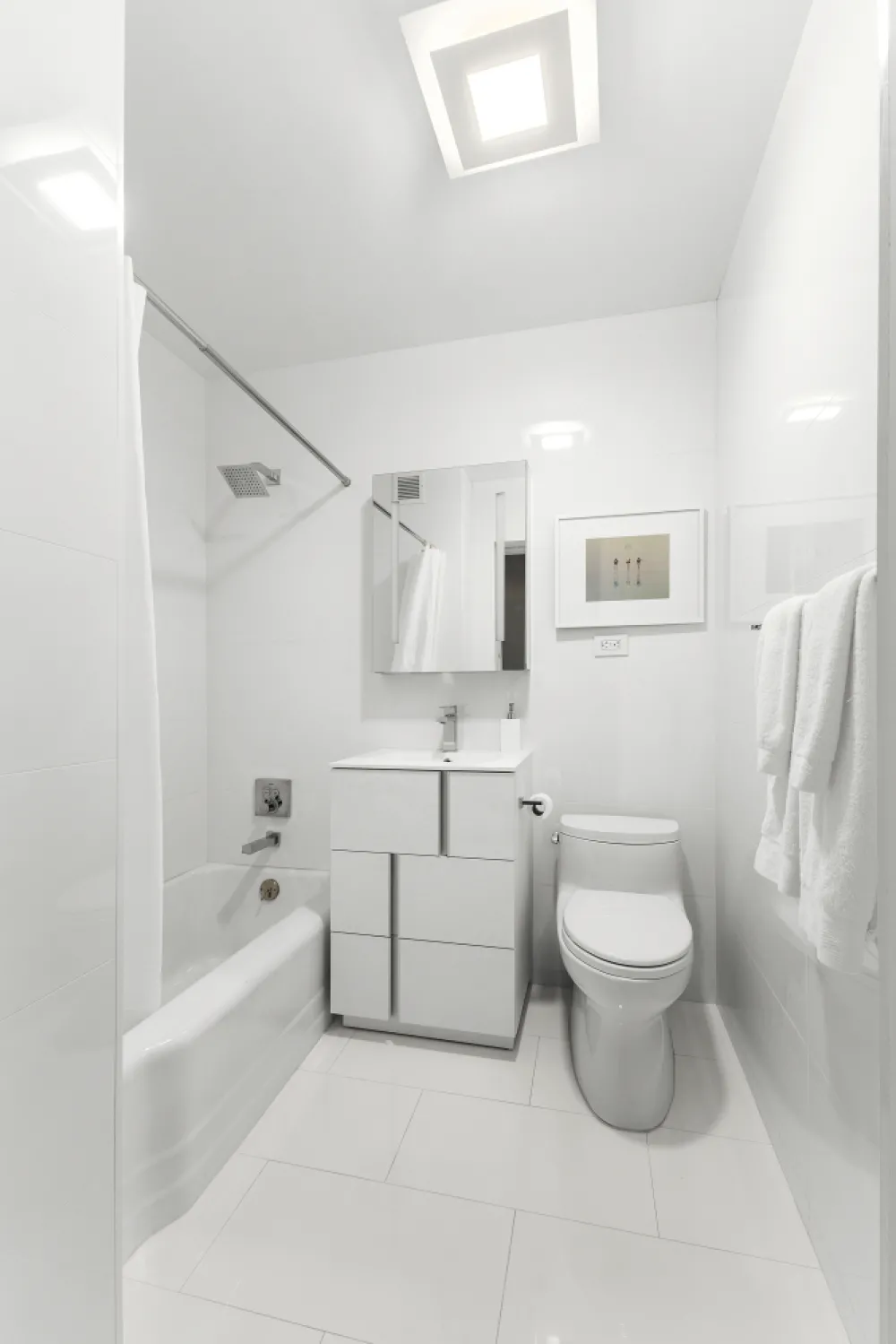 The bathroom features Porcelanosa tiles and includes an original iron bathtub, premium faucets from Delta and Axor, and exquisite fixtures throughout. Sophisticated ceiling lighting from Sonneman enhances the modern appeal of the room.