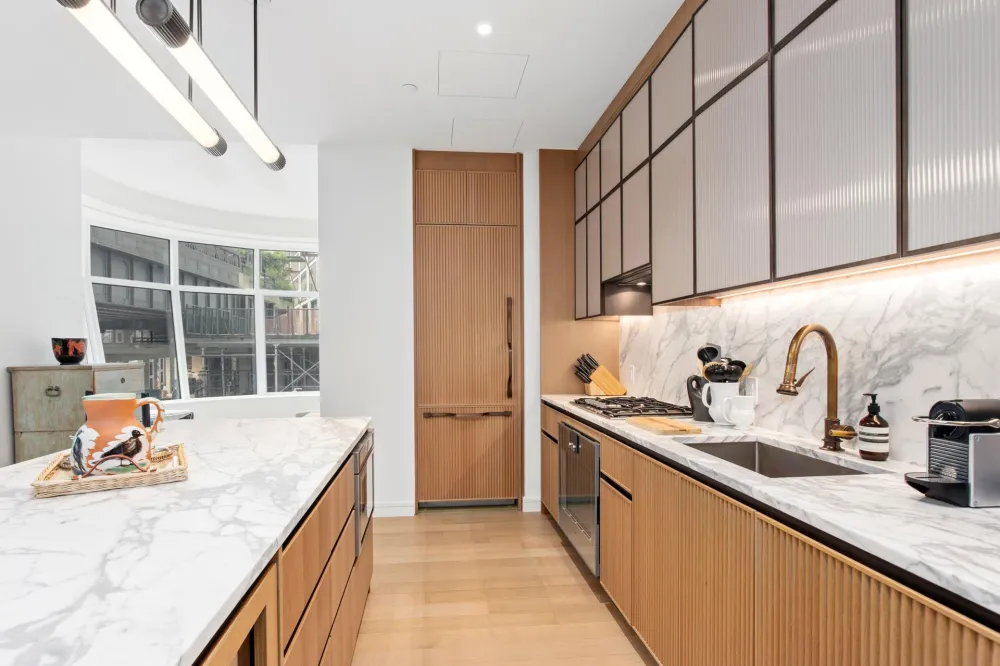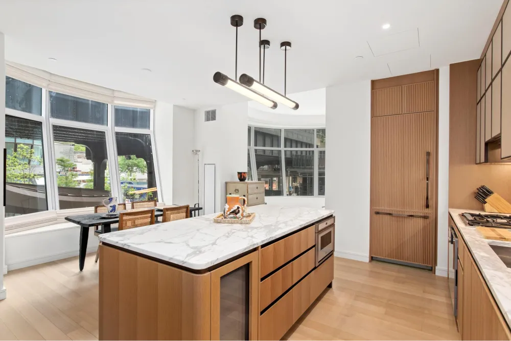 Unit 206 is an oversized large 1 bedroom 1.5 bath w/ great room southeast corner exposure, unit includes a large storage cage. Convertible two bed and views of the upcoming High Line Park. The gracious foyer lead to generous kitchen custom designed by March & White, custom bronze finished trim & hardware, Gaggenau appliances, wine fridge, custom suspended light fixture of bronze-finished metal and specialty glass, convex fluted oak cabinetry, Calacatta Venato marble slab countertops and backsplash, 5 wide plank French oak flooring, washer/dryer, and ceiling heights of up to 10' 9". Primary bathroom features double sink Nestos Beige marble slab flooring & walls, Polished Opal White marble countertops, a built-in mirror and medicine cabinet custom-designed bronze-finished metal and specialty glass wall sconces and fluted mirror panels, custom vanity, wall-mounted Toto toilet and radiant floor heating. The powder room features a Polished Black Onyx slab feature wall and flooring. Unit complete w/ fractal auto window shades from Related Home Experts.