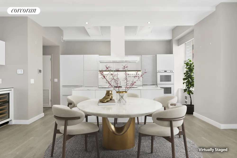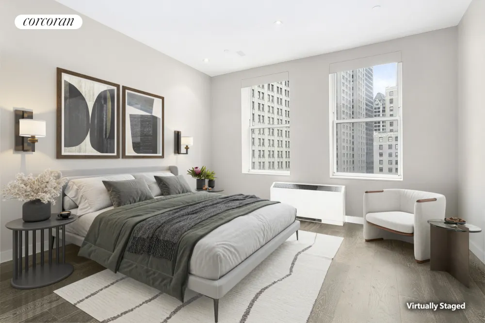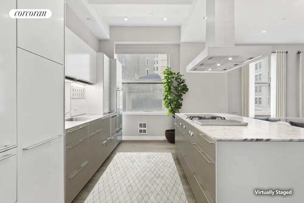 Enter the apartment to a spacious foyer that leads to a 20" gallery hall punctuated by an open, windowed European chef's kitchen which offers custom cabinetry, double Gaggenau wall ovens, Subzero fridge/freezer and a marble center island with a five-burner cooktop. The expansive 26" x 22" corner living/dining room is perfect for entertaining and is surrounded by oversized windows overlooking the iconic New York Stock Exchange and Federal Hall.