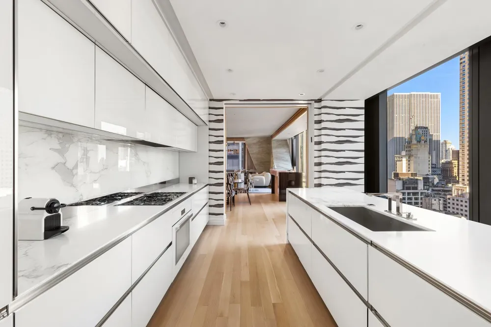 The kitchen, designed by Thierry Despont for Molteni, is as stylish as it is functional. Sleek marble countertops, polished cabinetry, and a full suite of high-end Miele and Sub-Zero appliances make it perfect for everything from a morning coffee to an elaborate dinner gathering.