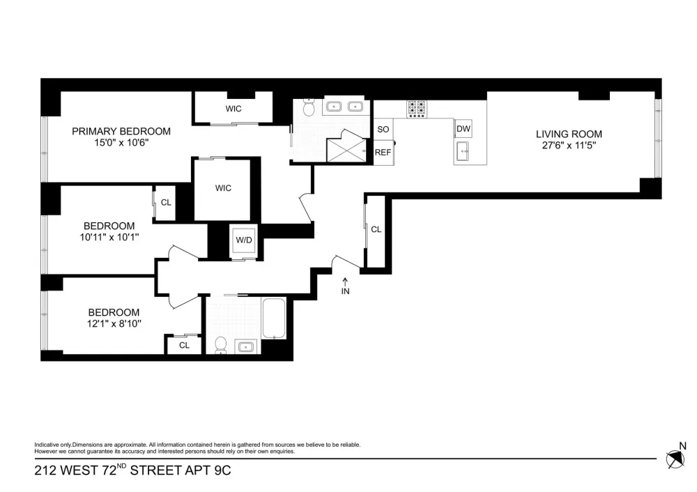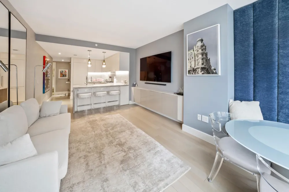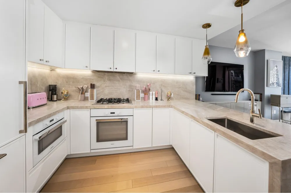 The Sale will include two private Storage Closets just outside the apartment. 9C at 212 West 72nd St. is a move-in ready 3-bedroom 2-bath home with custom interior design by CetraRuddy. The white oak entry door with keyless entry opens into a large entry foyer with a large coat closet. There are 5" plank white oak floors throughout the apartment. The eat-in kitchen, features white matte lacquer cabinetry, Miele appliances, in sink disposal, honed quartzite slab countertops, backsplash, and waterfall edge.
