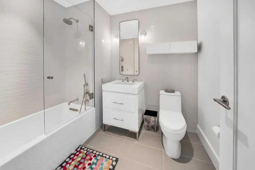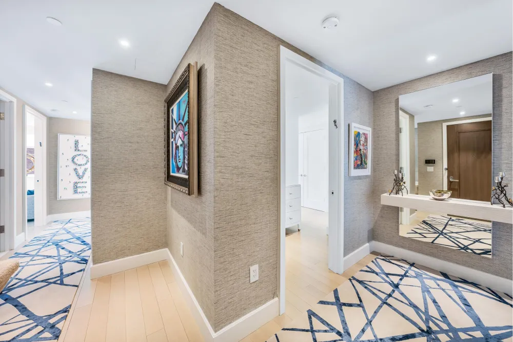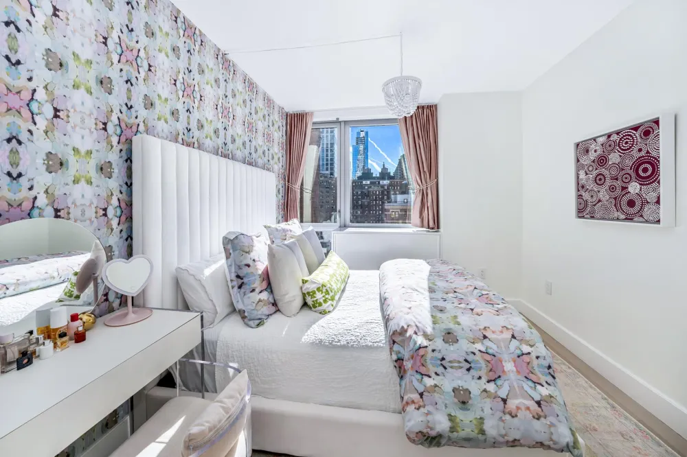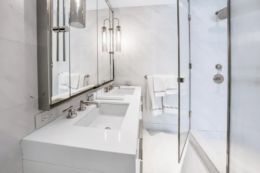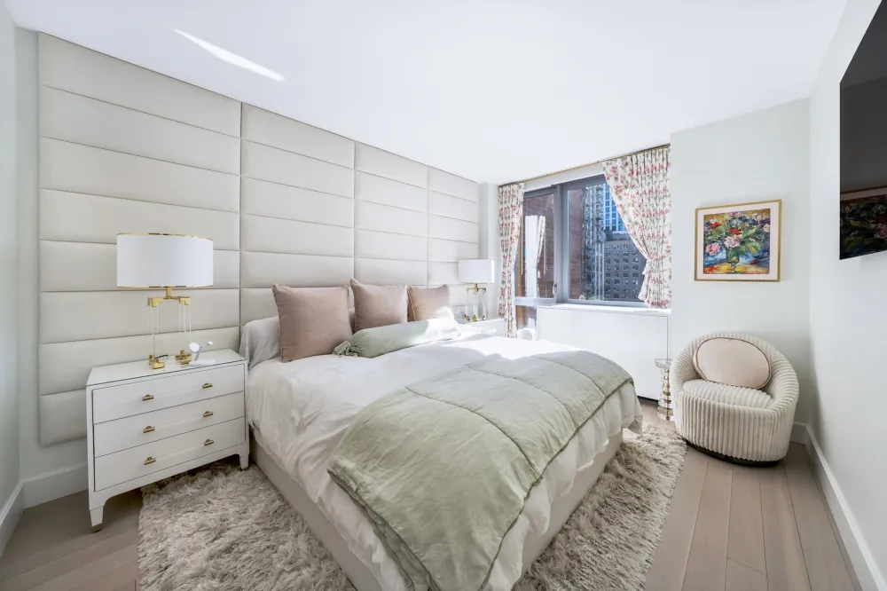 The bright south-facing primary bedroom suite, features two large customized walk-in closets and a luxuriously finished ensuite bath with Venus White marble tile floor and walls, millwork vanity clad in a leathered textile with a Pure White Caesarstone top, custom sconces, and polished nickel fixtures by Waterworks. The south facing second and third bedrooms have well-proportioned layouts with plenty of sunlight, the additional full bath features a textured matte grey tile floor, high-gloss white ceramic tile walls, white matte lacquer vanity, and brushed nickel fixtures by Waterworks. The residence also conveniently features a laundry closet, with a full size stacked washer and dryer.