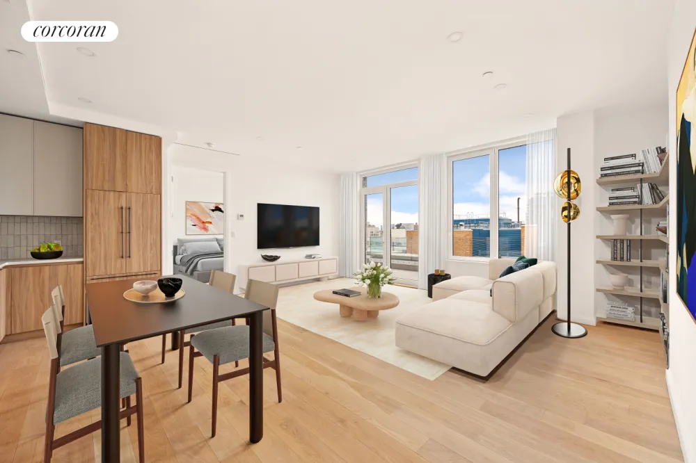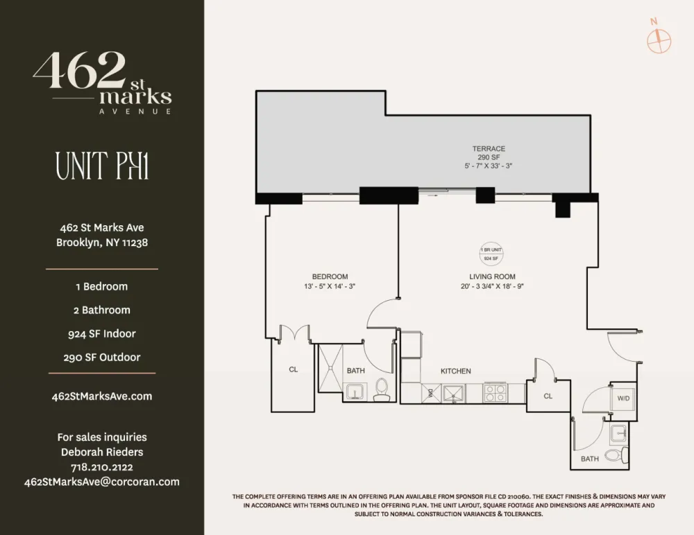 PH1 is an incredible 924 SF unit with an expansive great room that easily fits space for a living room and dining area. The 290 SF terrace has stunning views of the Manhattan skyline and ample room for eating and additional seating. The bedroom includes a full bathroom en suite plus large walk-in closet... See more