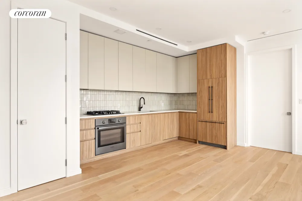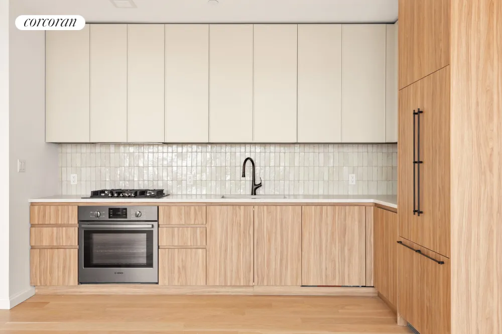 Soaring 10" minimum ceilings and oversized windows are the defining characteristics of these light-filled homes. The corner orientation assures that almost every unit has multiple exposures, and this is most evident in the open plan living and dining rooms. Kitchens have been carefully crafted to include maximum storage and pantry space within custom floor-to-ceiling oak and lacquer cabinetry, paneled appliances including a Fisher-Paykel fridge, Beko Dishwasher, a Bosch gas cooktop & convection oven, and striking terracotta backsplashes and natural quartz countertops. Primary bathrooms are awash in Calacatta Gold marble mosaics with glass-enclosed walk-in showers that include custom storage niches and are complemented by large vanities and oversized decorative mirrors. The secondary baths are equally impressive with handmade tiles, great lighting, and oversized niches. Oil-rubbed bronze fixtures add a handcrafted touch.