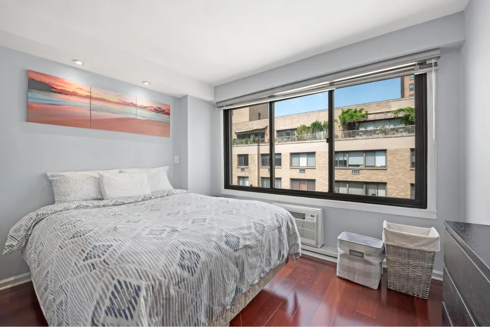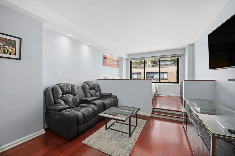 The separate sleeping is located two steps up, with a half wall for privacy. Additional features include new floors throughout, through-wall a/c and great closet space. This is a must-see for anyone seeking a comfortable home or pied-a-terre, complete with modern renovations and central location.