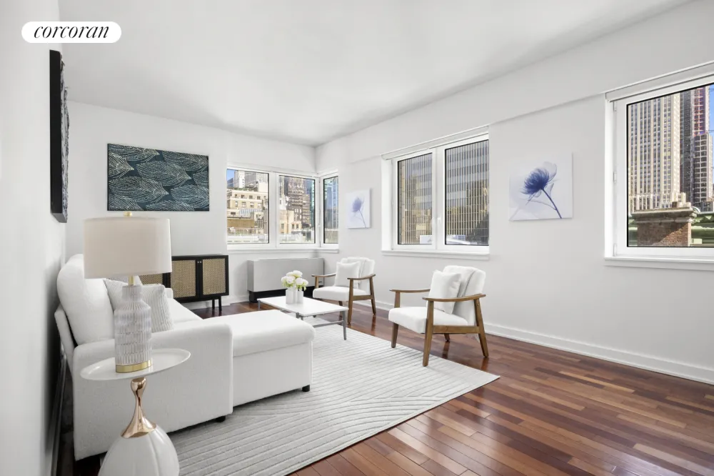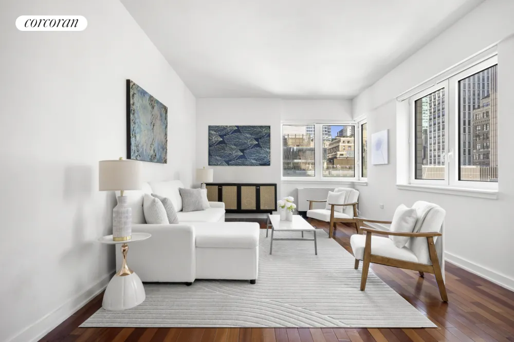 Perched on the 22nd floor, this bright and serene one-bedroom residence offers sweeping skyline views and exceptional value in a premier Midtown location. Oversized windows and North and West exposures flood the home with natural light throughout the day, creating a peaceful retreat above the city.
