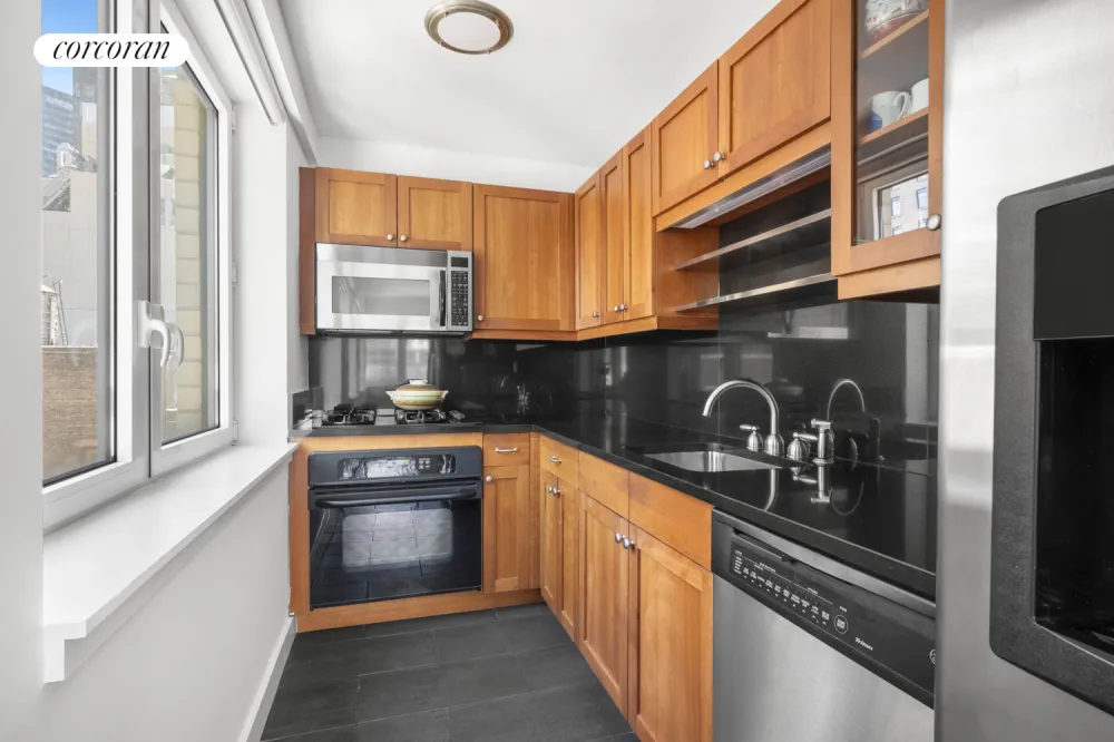The gracious layout features a corner living room with open views, a windowed kitchen appointed with cherry wood cabinetry, sleek black granite countertops, stainless steel appliances, and Kohler fixtures. The king-sized bedroom offers generous closet space and equally captivating views, while a charming windowed nook is perfect for a home office. The spa-like bathroom includes Italian white tile, a walk-in shower, a deep soaking tub, and heated towel racks for added comfort.