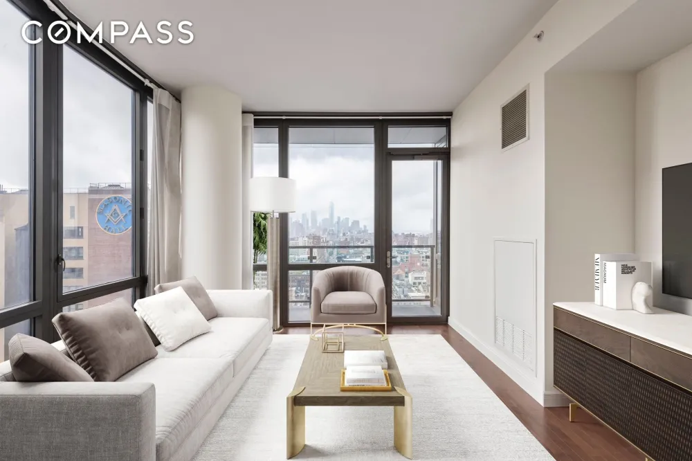The primary bedroom features two closets including a huge walk-in closet, the envy of most New Yorker's, and an en-suite spa bath with a double sink vanity, deep soaking tub and a rain shower stall. Additional features include electric blinds throughout the home, custom outfitted closets, central air, and a private balcony off of the living room..