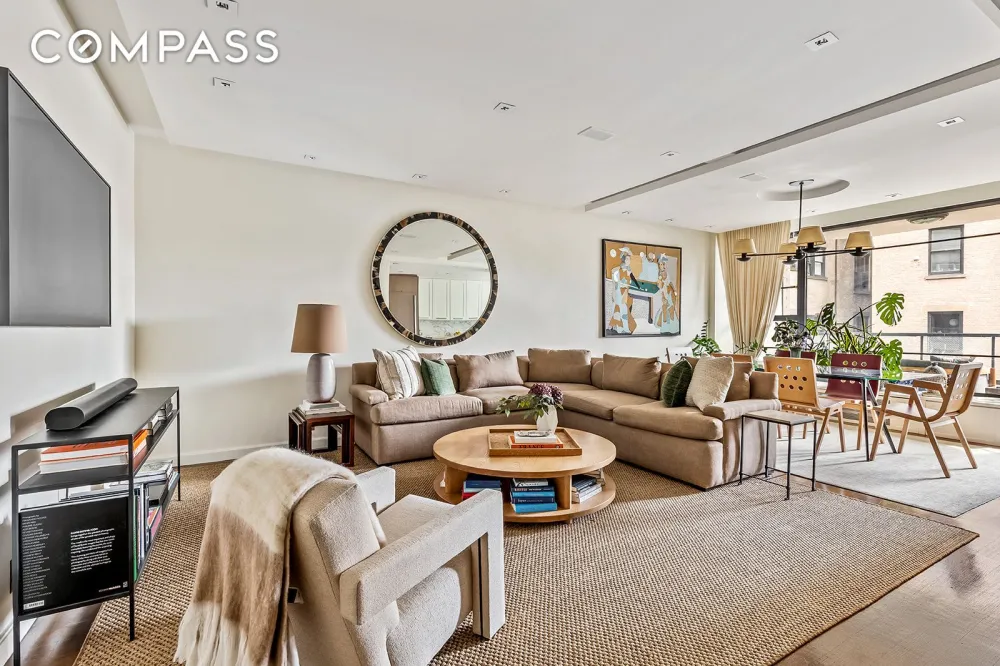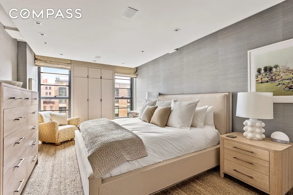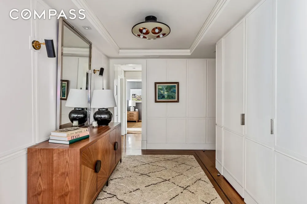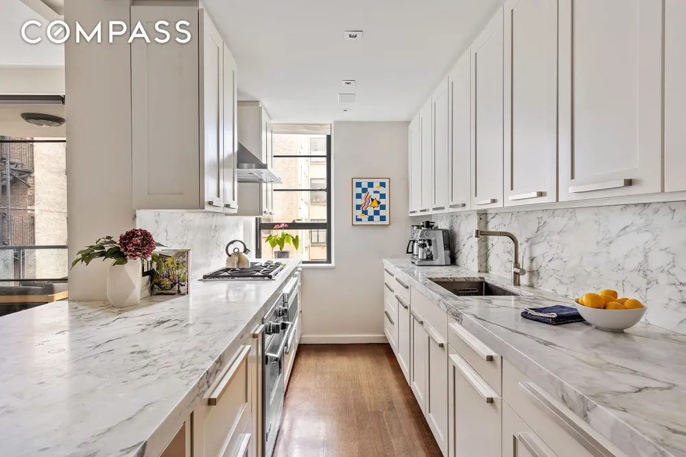 The reimagined layout blends modern luxury with timeless elegance. A gracious foyer with custom floor-to-ceiling closets leads to a spacious, light-filled living and dining area. Floor-to-ceiling south-facing windows open to a private terrace overlooking the building’s tranquil landmarked gardens and protected Greenwich Village views.