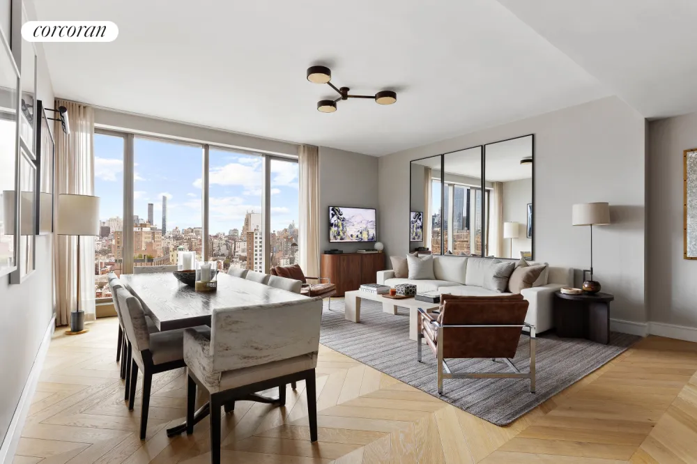 Residence East 20D at One High Line is a stunning 1,754 SF two-bedroom, two-and-a-half-bathroom corner home with sweeping north and east exposures through floor-to-ceiling windows. The expansive great room features natural oak chevron flooring and flows into a beautifully appointed open kitchen with... See more